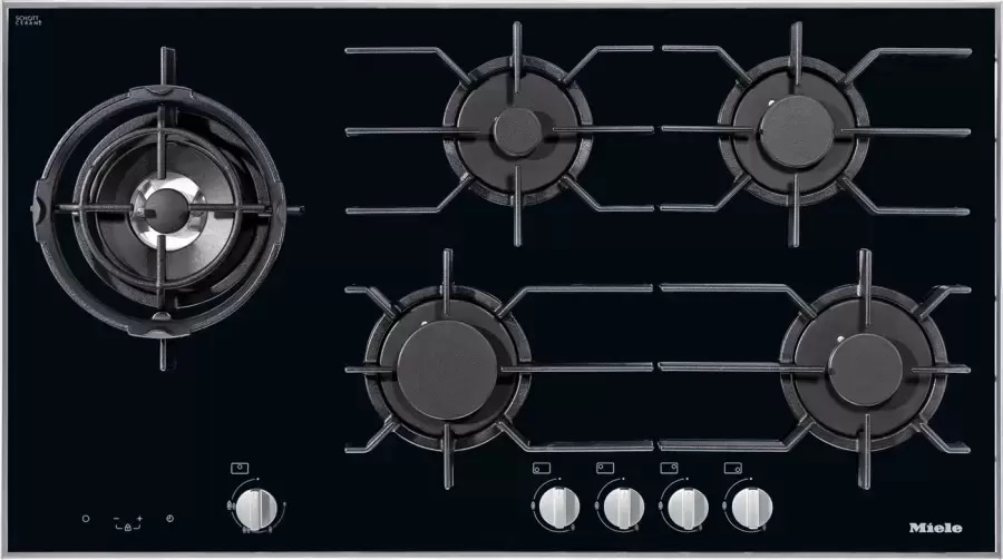 Панель газовых конфорок Miele KM 3054-1 на пять конфорок — стильная модель из ударопрочной стеклокерамики в стальной рамке шириной 94 см. Большая конфорка-WOK «двойная корона» расположена отдельно для повышения безопасности использования. Чугунные съемные решетки оригинальной формы ComfortClean устойчивы и удобны в очистке, их можно мыть в посудомоечной машине. Механическое управление с помощью поворотных переключателей дополнено функцией QuickStart для быстрого поджига.