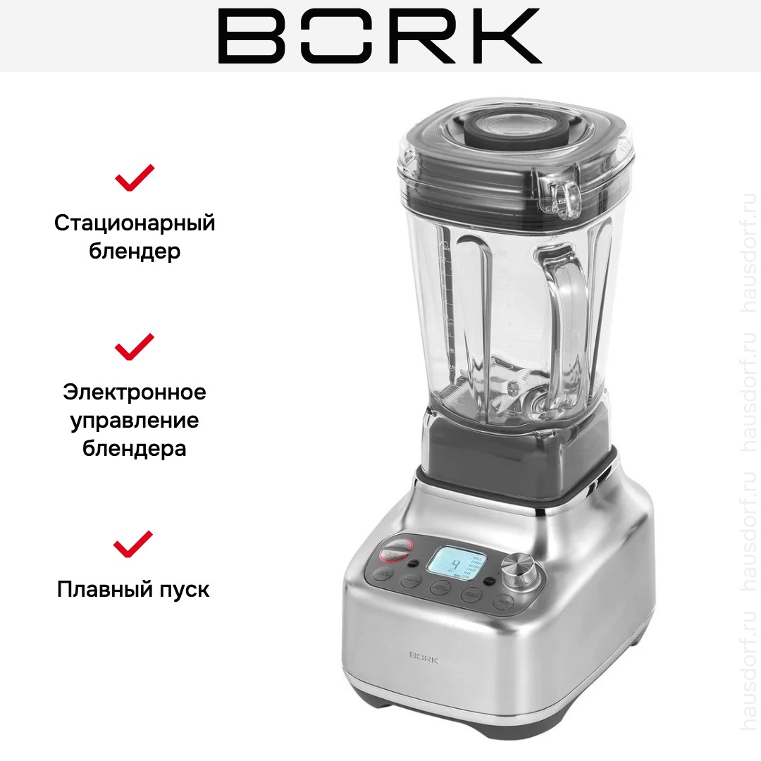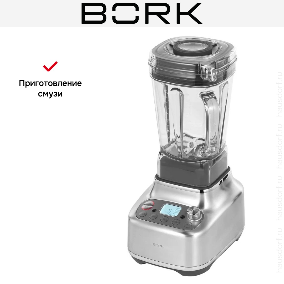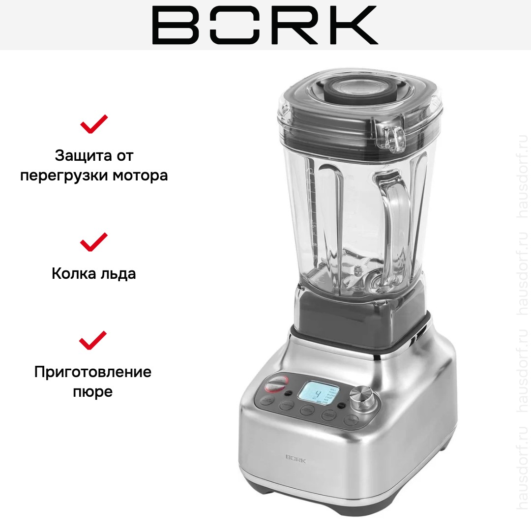 Отличается блендер BORK B805 от других моделей наличием умной системы охлаждения, которая активируется только при повышении температуры, за счет чего значительно снижается уровень шума при работе. Более удобным сделает процесс приготовления запуск таймера для автономной работы блендера. Режим SOUP позволит на максимальной скорости нагревать смесь до 65°C, в результате чего можно получить суп-пюре комфортной температуры.