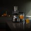Сокоблендер Bork B806 — многофункциональный прибор, объединяющий функции блендера и центробежной соковыжималки. В стальном основании размещается двигатель мощностью 1350 Вт, способный развивать скорость до 13000 об/мин. На основании крепится универсальная чаша из тритана объемом 1,5 литра, в которой можно смешивать продукты и получать сок. Электронная панель управления с кнопками и дисплеем позволяет выбирать одну из 10 скоростей, исходя из типа продуктов. Предусмотрены кнопки для запуска программы автоочистки, а также четырех программ приготовления смузи, замороженных коктейлей и измельчения льда. Загрузочный желоб диаметром 88 мм позволяет выжимать сок из неразрезанных фруктов, экономя время. Для измельчения служат стальные ножи Kinetix, а для удаления мякоти предусмотрен мелкоячеистый фильтр.