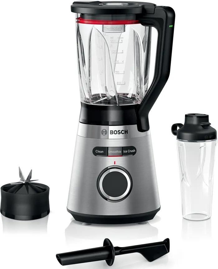Стационарный блендер Bosch позволяет готовить смузи, коктейли, смешивать соусы и заправки, измельчать продукты до состояния пюре и многое другое. Его конструкция подразумевает автономную работу — вам нужно только положить овощи или фрукты и выбрать режим. Корпус сделан в основном из металла, что повышает надежность прибора. Он может как влиться в общую гамму интерьера, так и стать ярким акцентом; доминирующий цвет — нержавеющая сталь.