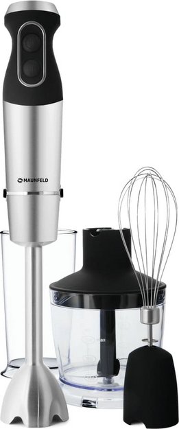 Погружной блендер Maunfeld позволяет готовить смузи, коктейли, смешивать соусы и заправки и многое другое. Такая конструкция требует вашего участия — нужно держать рукоятку с насадкой и контролировать направление движения. Плюс в том, что можно использовать ее прямо в кастрюле, когда готовите, например, суп-пюре. Корпус сделан в основном из металла, что повышает надежность прибора. Он может как влиться в общую гамму интерьера, так и стать ярким акцентом; доминирующий цвет — черный.