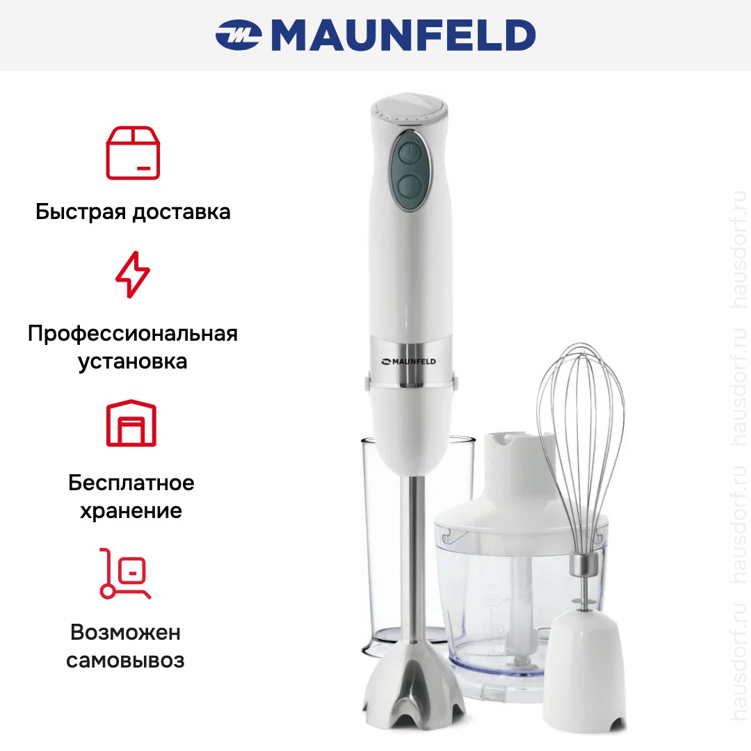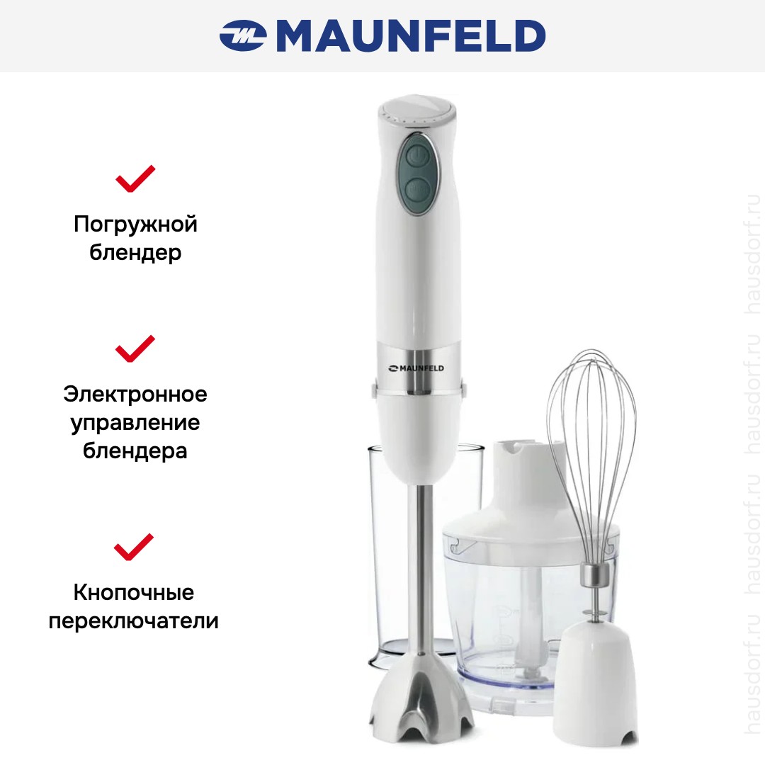 Блендер Maunfeld MHBL.1000W — высокопроизводительный погружной прибор, разработанный для тех, кто требует максимальной гибкости и точности в кулинарных процессах. Обладая мощностью 1000 ватт, он уверенно справляется с самыми разнообразными задачами: от измельчения твёрдых овощей и замороженных фруктов до приготовления нежных пюре, густых крем-супов, соусов и даже домашнего фарша.