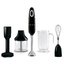 Переключатели выполнены в форме кнопок, что делает управление интуитивно понятным. Возможна плавная регулировка скорости вращения, что позволяет выбирать оптимальный режим для каждой конкретной задачи. В комплект входят различные аксессуары: измельчитель, насадка для пюре, насадка-венчик и ножи из нержавеющей стали с системой FlowBlend. Это позволяет использовать прибор для различных кулинарных задач — от приготовления пюре и смузи до взбивания кремов и белков.