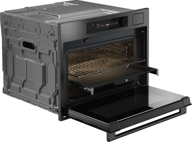 Особенности дизайна и внешней панели управления — также важный пункт при выборе духовки на кухню. В данной модели нужно обратить внимание на цвет — черная сталь,