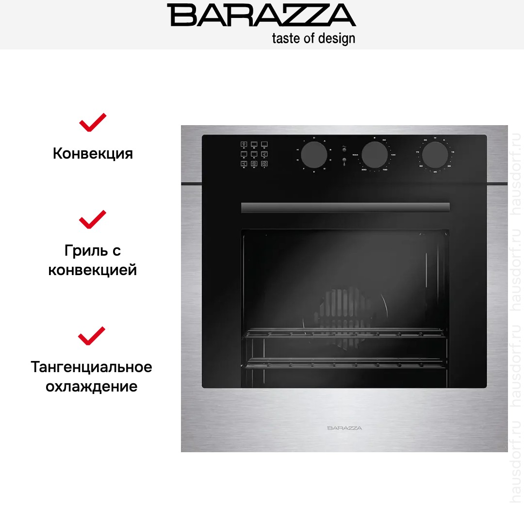 Количество режимов работы в духовом шкафу Баразза: 8. В число доступных программ входят: классический нагрев, верхний нагрев, нижний нагрев, конвекция, гриль для создания хрустящей корочки, и другие. Помимо основных программ воспользуйтесь специальными возможностями этого прибора: размораживанием продуктов, чтобы сократить время на подготовку; быстрым разогревом для ускорения работы; и другими. Тип гриля в этой модели — электрический.