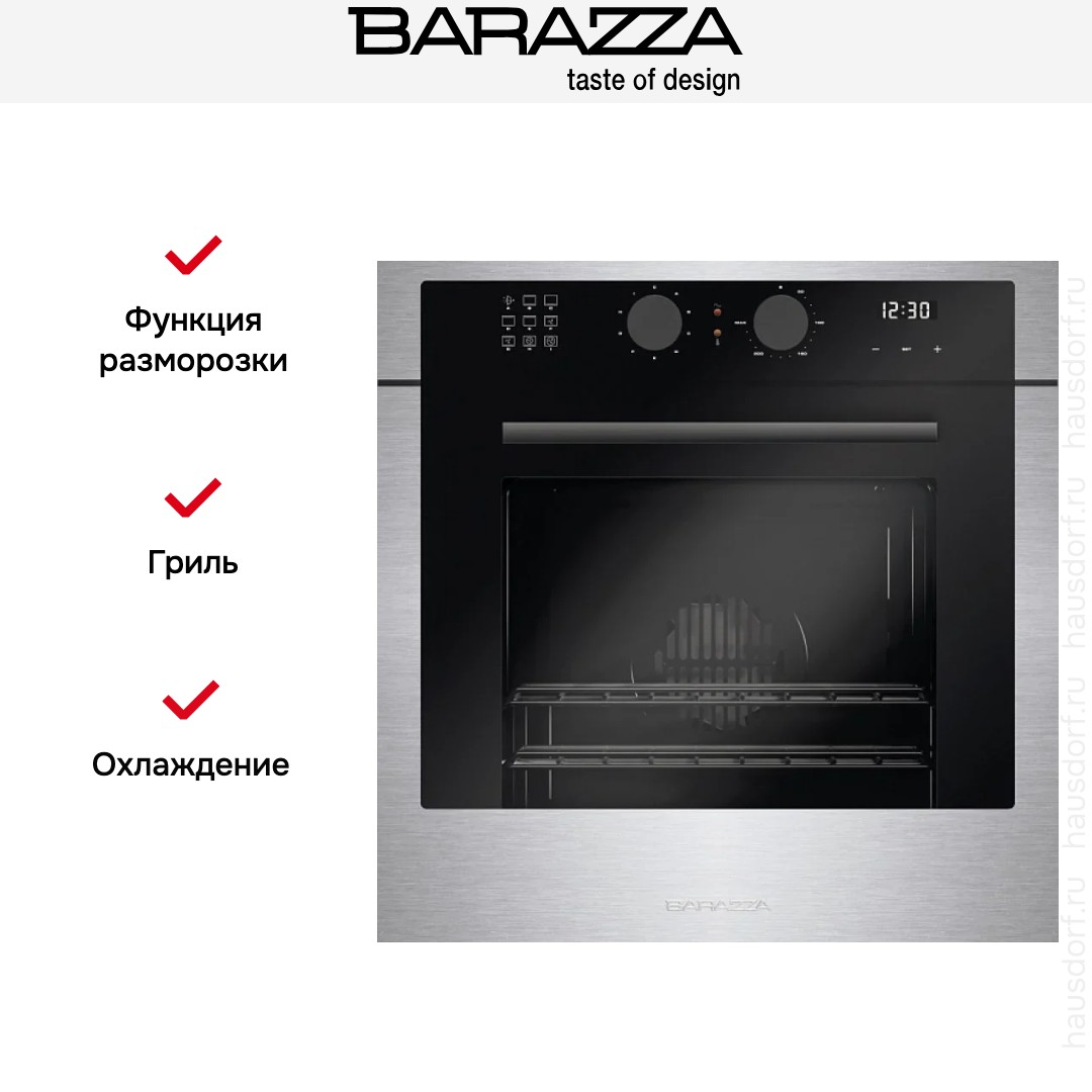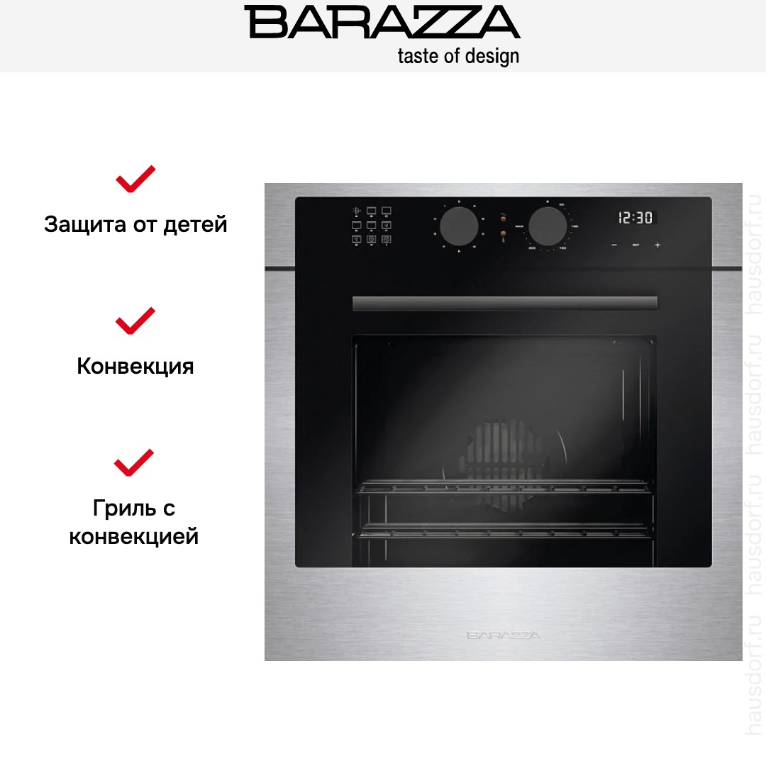 Количество режимов работы в духовом шкафу Баразза: 8. В число доступных программ входят: классический нагрев, верхний нагрев, нижний нагрев, конвекция, гриль для создания хрустящей корочки, и другие. Помимо основных программ воспользуйтесь специальными возможностями этого прибора: размораживанием продуктов, чтобы сократить время на подготовку; быстрым разогревом для ускорения работы; и другими. Тип гриля в этой модели — электрический.