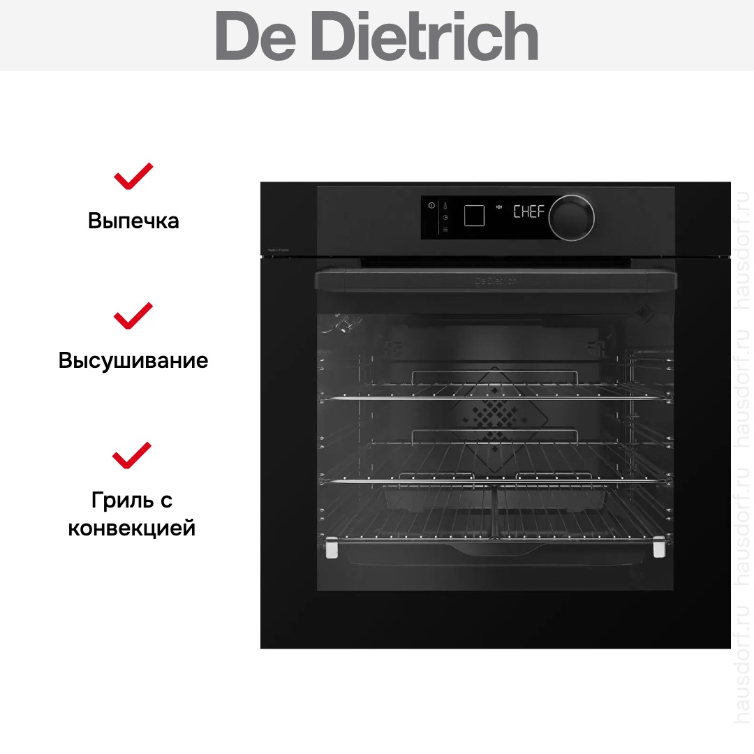 Количество режимов работы в духовом шкафу Де Дитрих: 11. В число доступных программ входят: конвекция, гриль для создания хрустящей корочки, сушка для овощей и фруктов, и другие. Помимо основных программ воспользуйтесь специальными возможностями этого прибора: размораживанием продуктов, чтобы сократить время на подготовку; комбинацией нижнего и вентиляционного нагрева и другими. Тип гриля в этой модели — электрический.