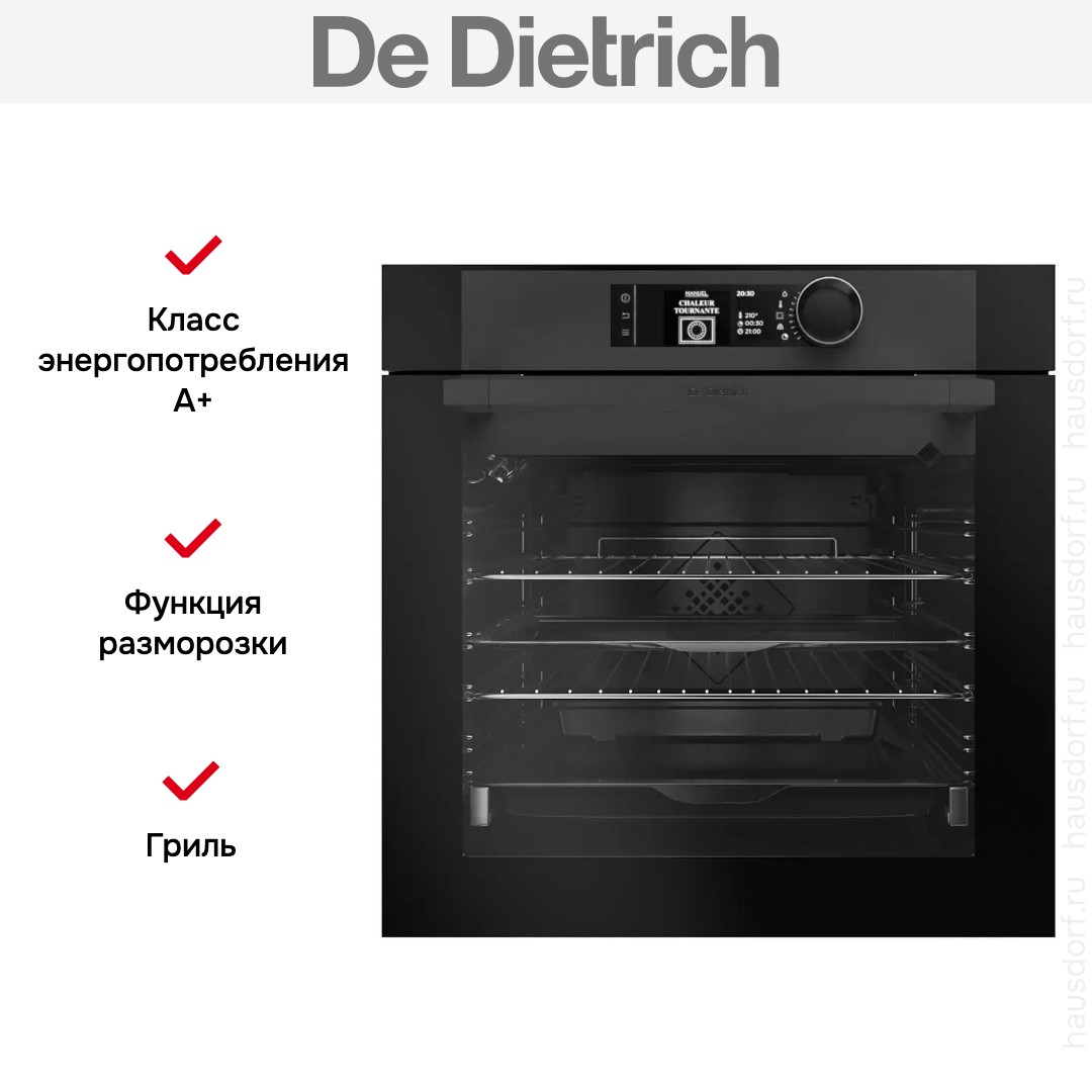 Количество режимов работы в духовом шкафу Де Дитрих: 14. В число доступных программ входят: классический нагрев, конвекция, гриль для создания хрустящей корочки, сушка для овощей и фруктов, и другие. Помимо основных программ воспользуйтесь специальными возможностями этого прибора: размораживанием продуктов, чтобы сократить время на подготовку; и другими. Тип гриля в этой модели — электрический.