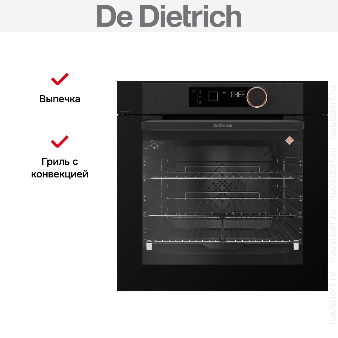 Количество режимов работы в духовом шкафу Де Дитрих: 10. В число доступных программ входят: конвекция, гриль для создания хрустящей корочки, и другие. Помимо основных программ воспользуйтесь специальными возможностями этого прибора: размораживанием продуктов, чтобы сократить время на подготовку; комбинацией нижнего и вентиляционного нагрева и другими. Тип гриля в этой модели — электрический.