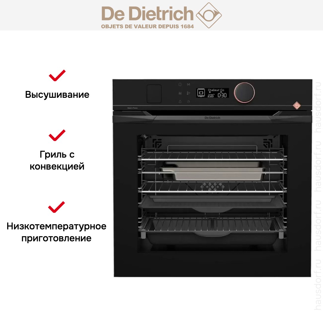 Количество режимов работы в духовом шкафу Де Дитрих: 23. В число доступных программ входят: классический нагрев, конвекция, дополнительное использование пара, гриль для создания хрустящей корочки, сушка для овощей и фруктов, и другие. Помимо основных программ воспользуйтесь специальными возможностями этого прибора: размораживанием продуктов, чтобы сократить время на подготовку; режимом Sous-Vide для приготовления нежных, диетических блюд в вакуумной упаковке; поддержанием температуры в камере на определенном уровне, чтобы блюда не остывали; и другими. Тип гриля в этой модели — электрический.