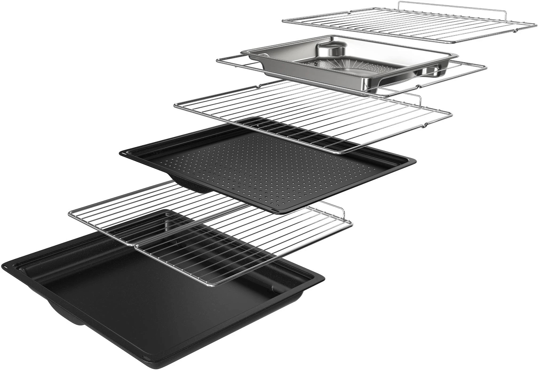 В стандартную комплектацию любого духового шкафа входят один или два противня — эмалированных или с антипригарным покрытием — и решетка. Единственный противень, как правило, имеет низкие бортики и предназначается для приготовления выпечки. Если духовка комплектуется двумя противнями, то второй отличается более высокими бортиками — его можно использовать для запекания мяса, птицы, овощных блюд. На решетке в духовке, не оснащенной грилем, обычно устанавливаются формы для запекания — стальные, керамические или стеклянные. В духовках премиум-класса количество противней может быть увеличено: к стандартному комплекту добавляются противни с перфорацией для мяса, специальные поддоны для сбора выделившегося сока.