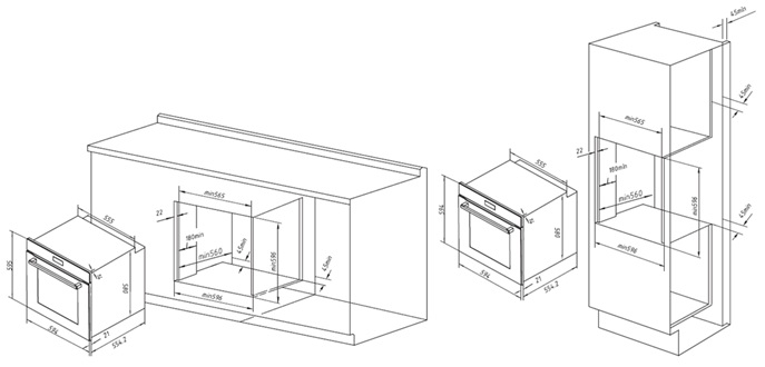 При установке требуется строго соблюдать правила техники безопасности — в частности, выдерживать размеры всех зазоров между стенками духовки и стенками мебели, необходимые для беспрепятственной циркуляции воздуха. Так, расстояние до боковых стенок мебели должно составлять не менее 0,5–1 см, а до задней стенки — не менее 4–5 см.