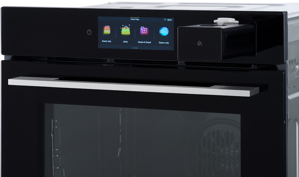 Резервуар обычно размещается за фасадом духового шкафа. В ряде моделей он располагается за панелью управления, которая при нажатии на соответствующую кнопку сдвигается вниз или вверх, предоставляя пользователю легкий доступ. В других устройствах резервуар находится в боковой стенке духовки. Воды в нем хватает для приготовления большинства блюд — емкость обычно рассчитана на 50–60 минут работы. Если вода внезапно заканчивается в процессе приготовления, ее можно долить, не выключая духовку.