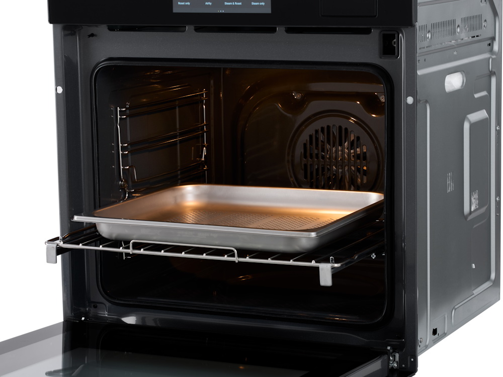 Циркуляция горячего воздуха в духовке позволяет создать условия для получения этой корочки, не используя масло и жир. При этом применяются оригинальные противни AirFry с перфорацией, позволяющие нагревать продукты со всех сторон, так что их даже не нужно переворачивать. Таким образом можно получать любимые блюда в более здоровом варианте, не тратя лишние средства.