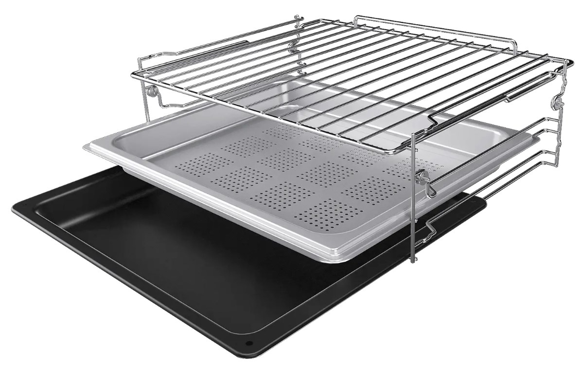 В стандартную комплектацию любого духового шкафа входят один или два противня — эмалированных или с антипригарным покрытием — и решетка. Единственный противень, как правило, имеет низкие бортики и предназначается для приготовления выпечки. Если духовка комплектуется двумя противнями, то второй отличается более высокими бортиками — его можно использовать для запекания мяса, птицы, овощных блюд. На решетке в духовке, не оснащенной грилем, обычно устанавливаются формы для запекания — стальные, керамические или стеклянные. В духовках премиум-класса количество противней может быть увеличено: к стандартному комплекту добавляются противни с перфорацией для мяса, специальные поддоны для сбора выделившегося сока.