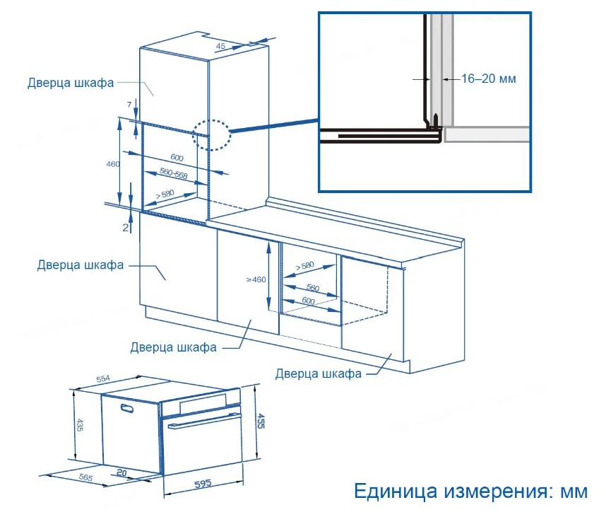 При установке требуется строго соблюдать правила техники безопасности — в частности, выдерживать размеры всех зазоров между стенками духовки и стенками мебели, необходимые для беспрепятственной циркуляции воздуха. Так, расстояние до боковых стенок мебели должно составлять не менее 0,5–1 см, а до задней стенки — не менее 4–5 см.