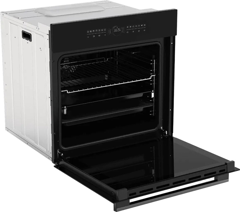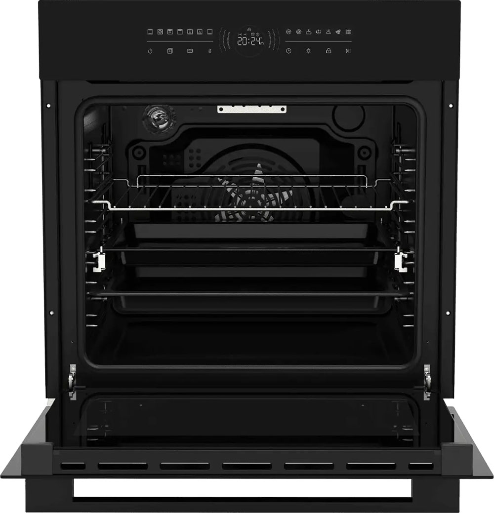 Особенности дизайна и внешней панели управления — также важный пункт при выборе духовки на кухню. В данной модели нужно обратить внимание на цвет — матовый черный,