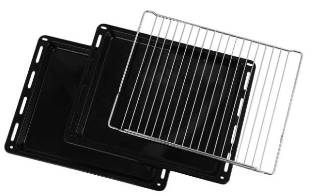 В стандартную комплектацию любого духового шкафа входят один или два противня — эмалированных или с антипригарным покрытием — и решетка. Единственный противень, как правило, имеет низкие бортики и предназначается для приготовления выпечки. Если духовка комплектуется двумя противнями, то второй отличается более высокими бортиками — его можно использовать для запекания мяса, птицы, овощных блюд. На решетке в духовке, не оснащенной грилем, обычно устанавливаются формы для запекания — стальные, керамические или стеклянные. В духовках премиум-класса количество противней может быть увеличено: к стандартному комплекту добавляются противни с перфорацией для мяса, специальные поддоны для сбора выделившегося сока.