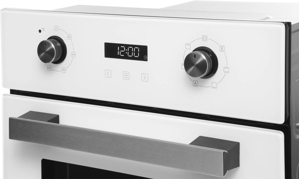 Особенности дизайна и внешней панели управления — также важный пункт при выборе духовки на кухню. В данной модели нужно обратить внимание на цвет — белое стекло, Механическая панель управления позволяет быстро разобраться в настройке программ и не требует чрезмерных усилий.