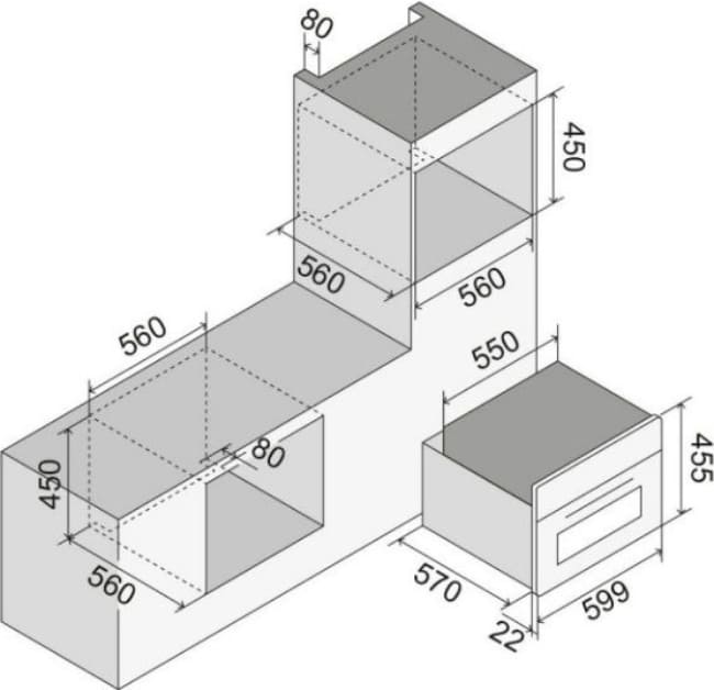 Размеры ниши для встраивания духового шкафа определяются, исходя из габаритов самого устройства. Стандартные модели обычно без труда устанавливаются в нишу шириной около 560 мм, высотой около 595 мм и глубиной примерно 550 мм. Следует помнить, что фасад устройства должен иметь большие размеры, чем величина ниши.