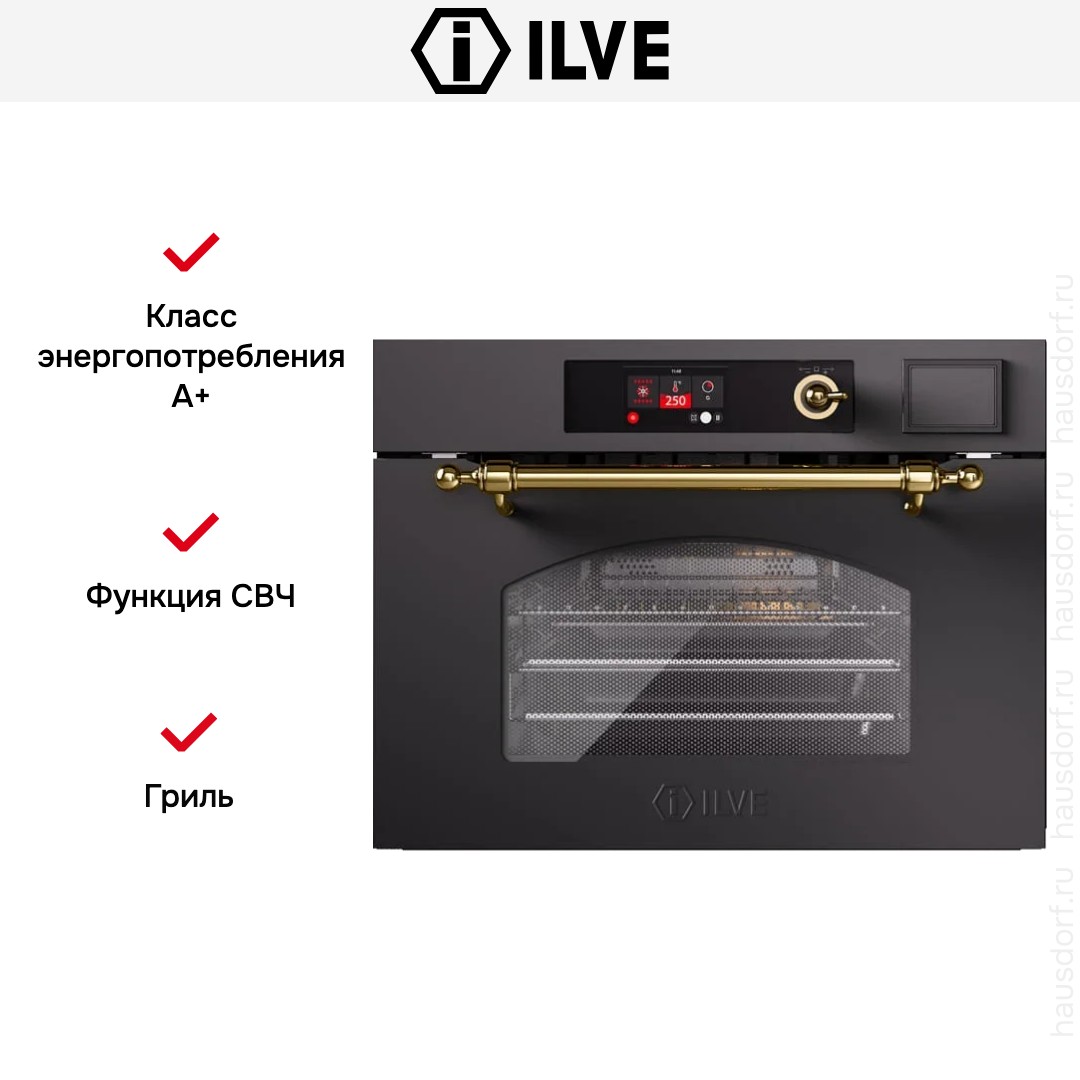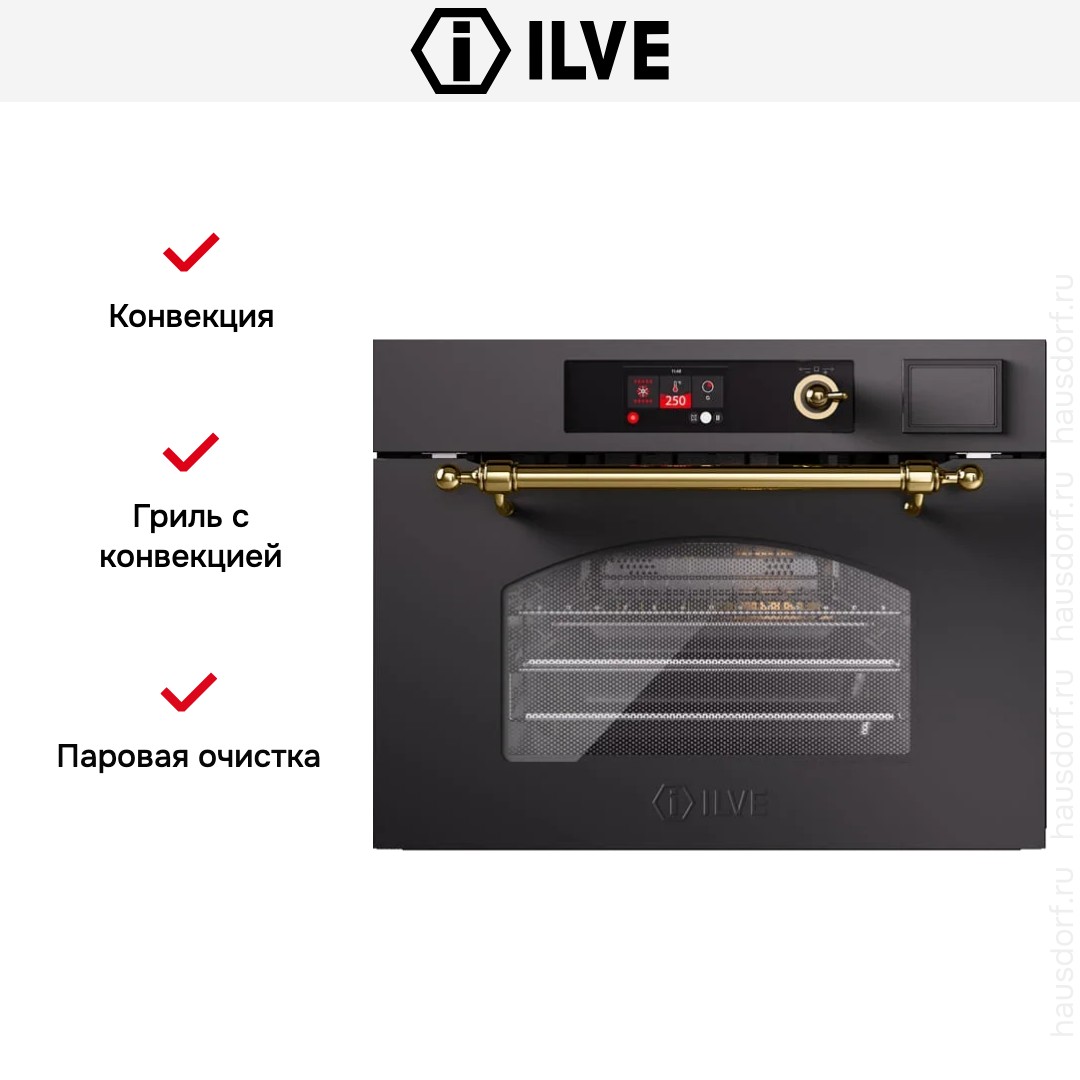 Количество режимов работы в духовом шкафу Илве: 10. В число доступных программ входят: конвекция, приготовление с помощью микроволн, дополнительное использование пара, гриль для создания хрустящей корочки, и другие. Тип гриля в этой модели — электрический.