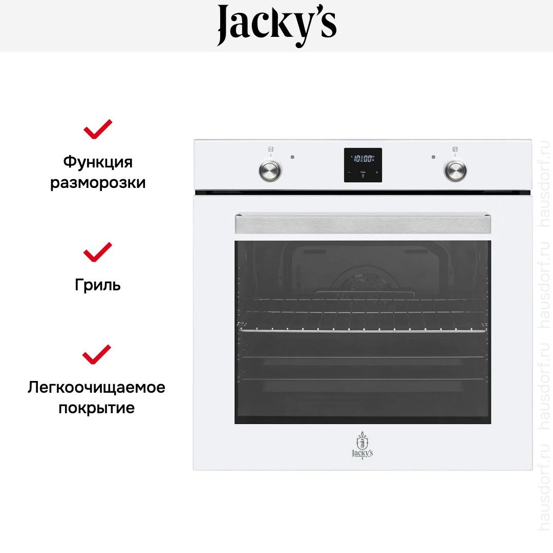 В духовом шкафу Джекис множество режимов работы. В число доступных программ входят: конвекция, гриль для создания хрустящей корочки, и другие. Помимо основных программ воспользуйтесь специальными возможностями этого прибора: размораживанием продуктов, чтобы сократить время на подготовку; быстрым разогревом для ускорения работы; вентилятором, совмещенным с нижним нагревом; и другими. Тип гриля в этой модели — электрический.