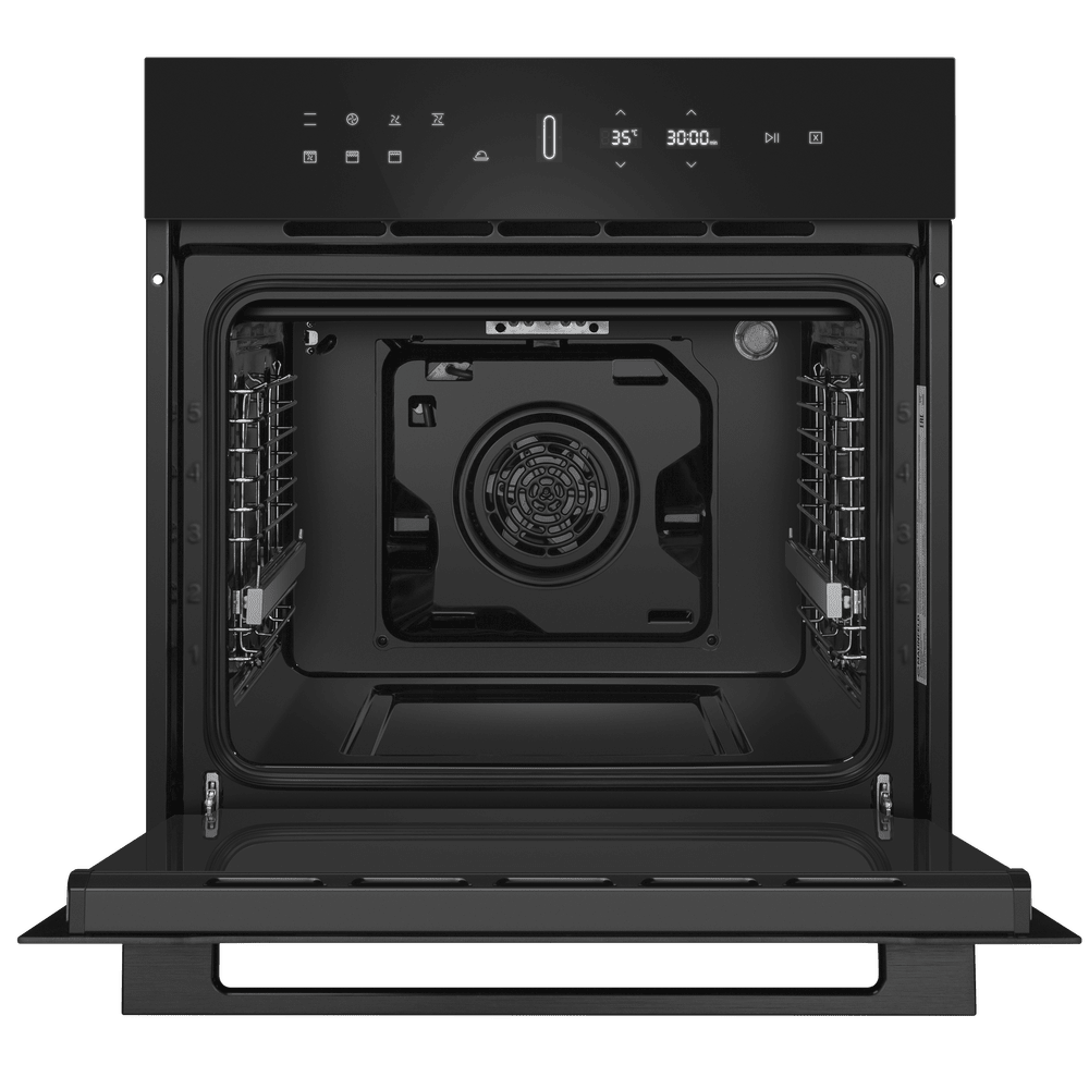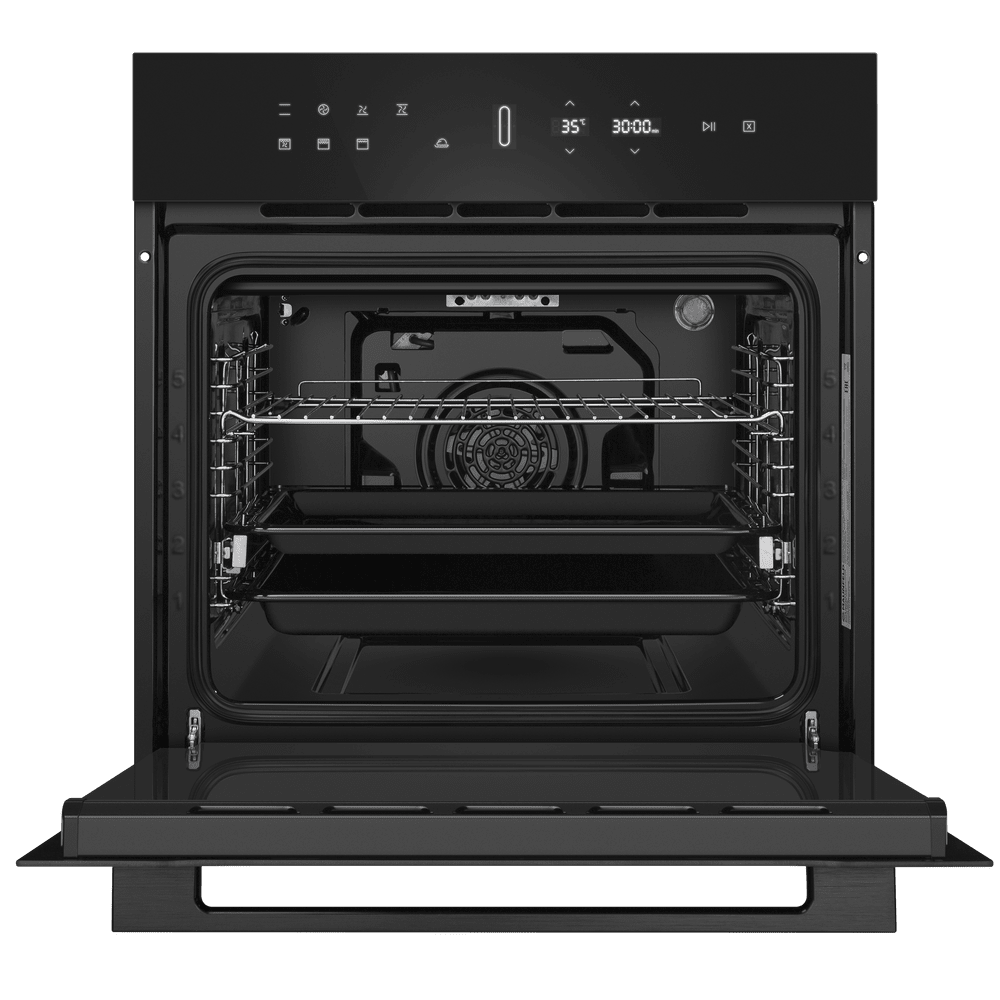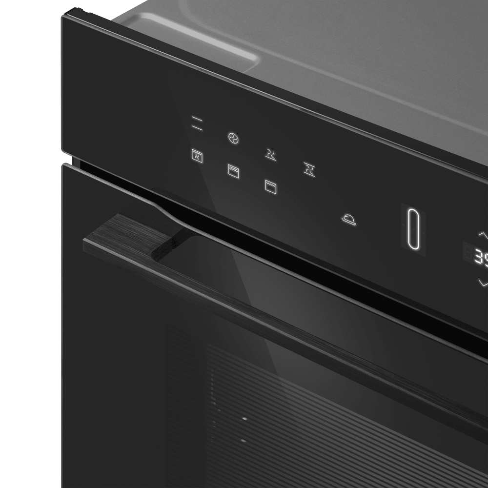 Особенности дизайна и внешней панели управления — также важный пункт при выборе духовки на кухню. В данной модели нужно обратить внимание на цвет — черный, охлаждение двери, чтобы поверхность и мебель вокруг не нагревались.