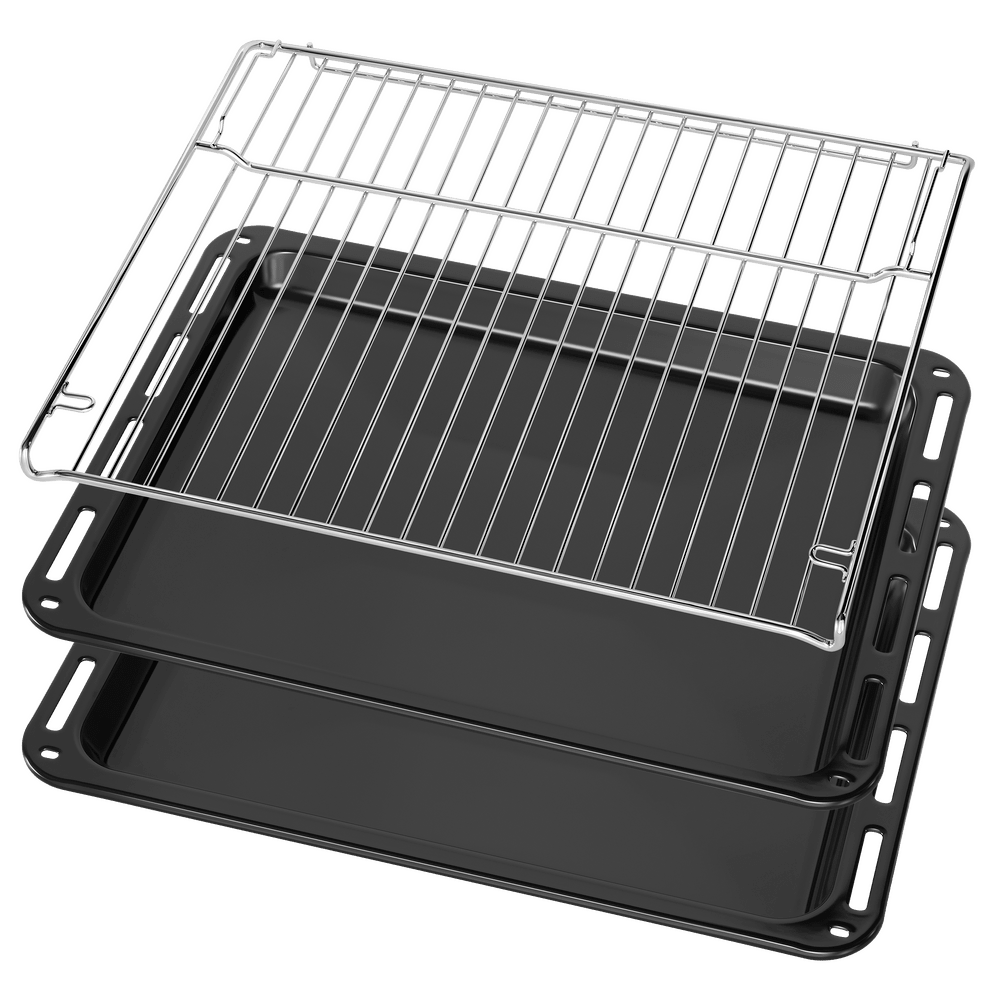 В стандартную комплектацию любого духового шкафа входят один или два противня — эмалированных или с антипригарным покрытием — и решетка. Единственный противень, как правило, имеет низкие бортики и предназначается для приготовления выпечки. Если духовка комплектуется двумя противнями, то второй отличается более высокими бортиками — его можно использовать для запекания мяса, птицы, овощных блюд. На решетке в духовке, не оснащенной грилем, обычно устанавливаются формы для запекания — стальные, керамические или стеклянные. В духовках премиум-класса количество противней может быть увеличено: к стандартному комплекту добавляются противни с перфорацией для мяса, специальные поддоны для сбора выделившегося сока.
