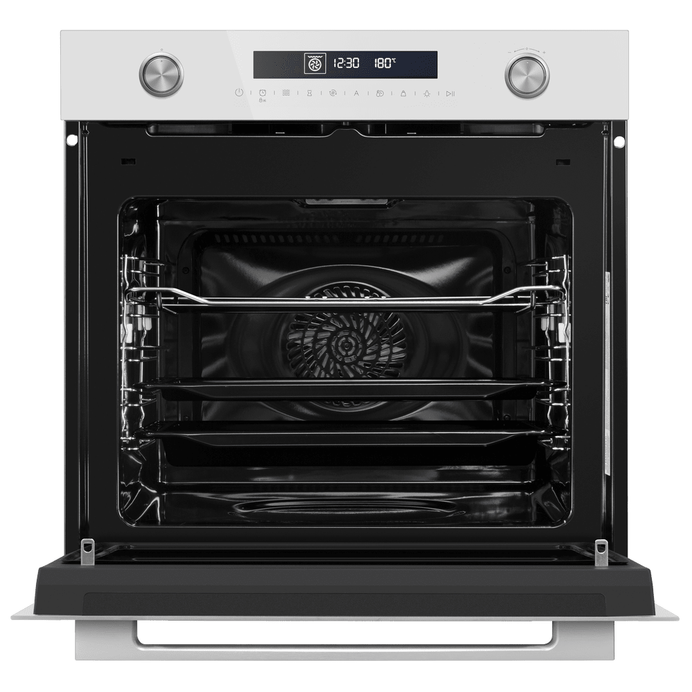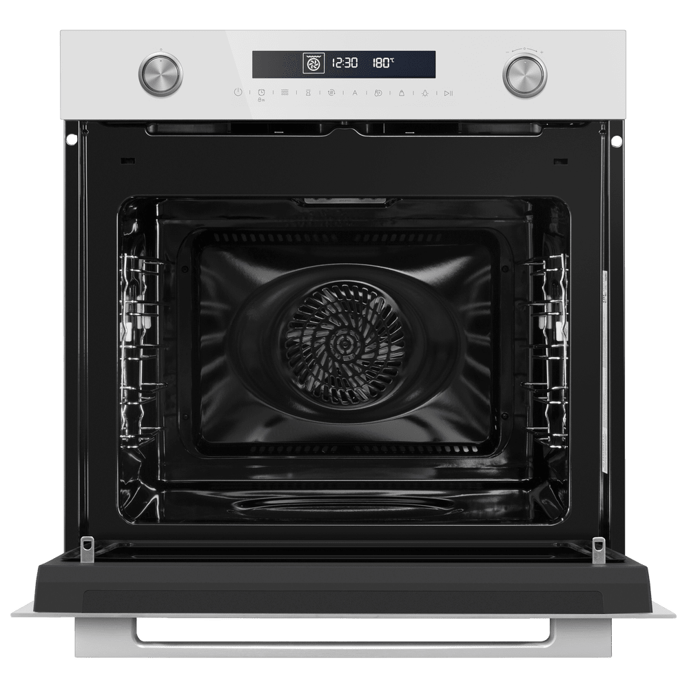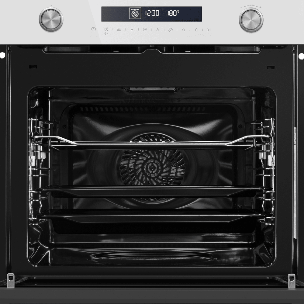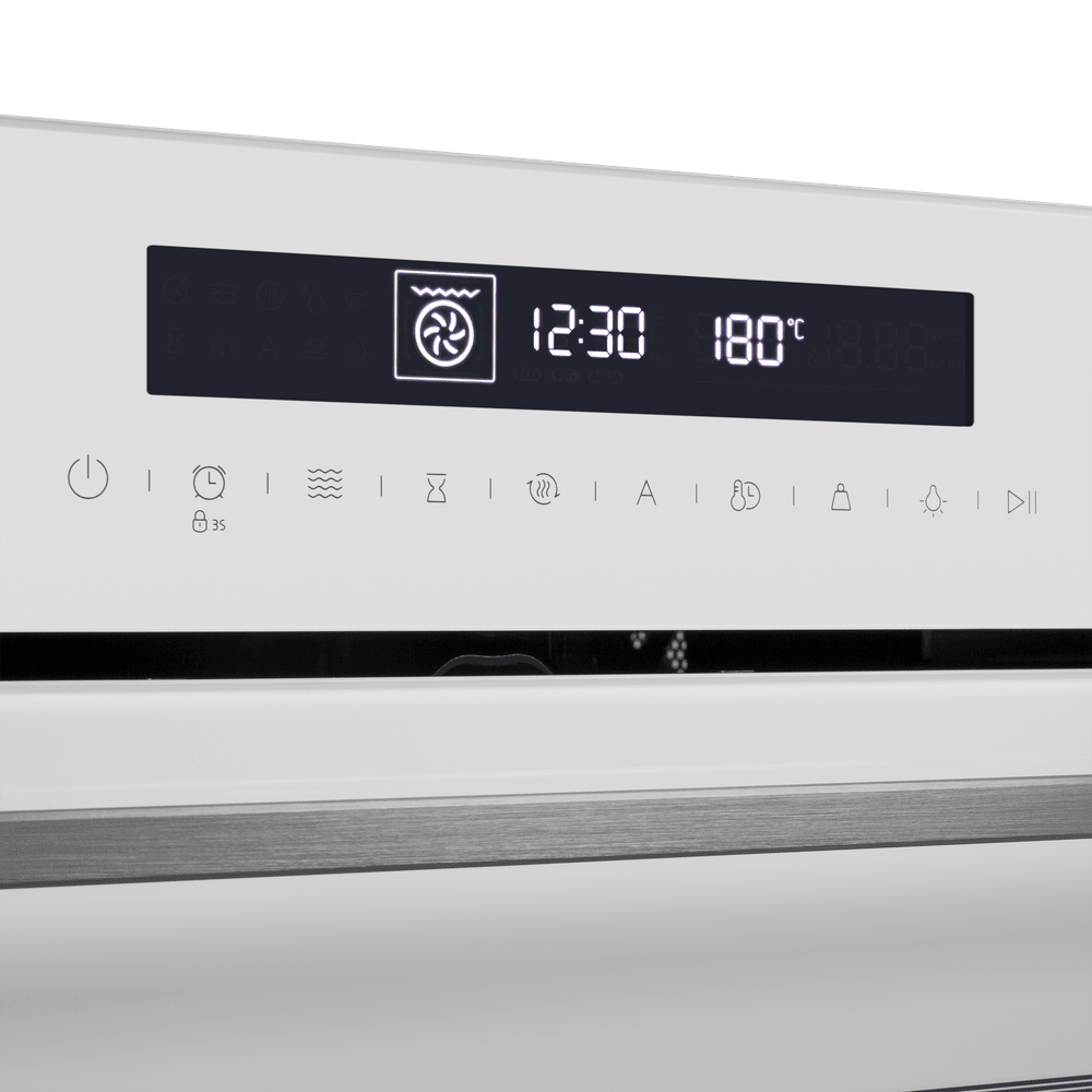Особенности дизайна и внешней панели управления — также важный пункт при выборе духовки на кухню. В данной модели нужно обратить внимание на цвет — белый, охлаждение двери, чтобы поверхность и мебель вокруг не нагревались.