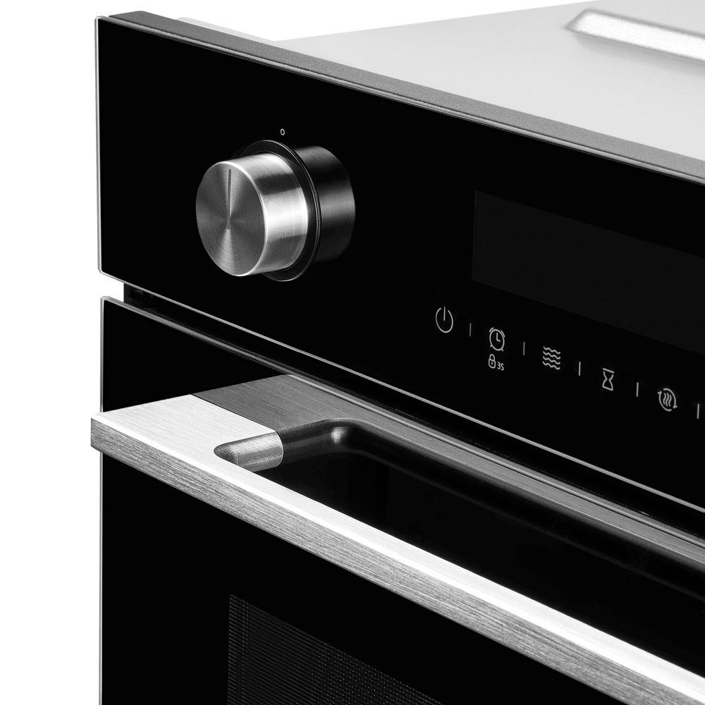 Особенности дизайна и внешней панели управления — также важный пункт при выборе духовки на кухню. В данной модели нужно обратить внимание на цвет — черный, охлаждение двери, чтобы поверхность и мебель вокруг не нагревались.