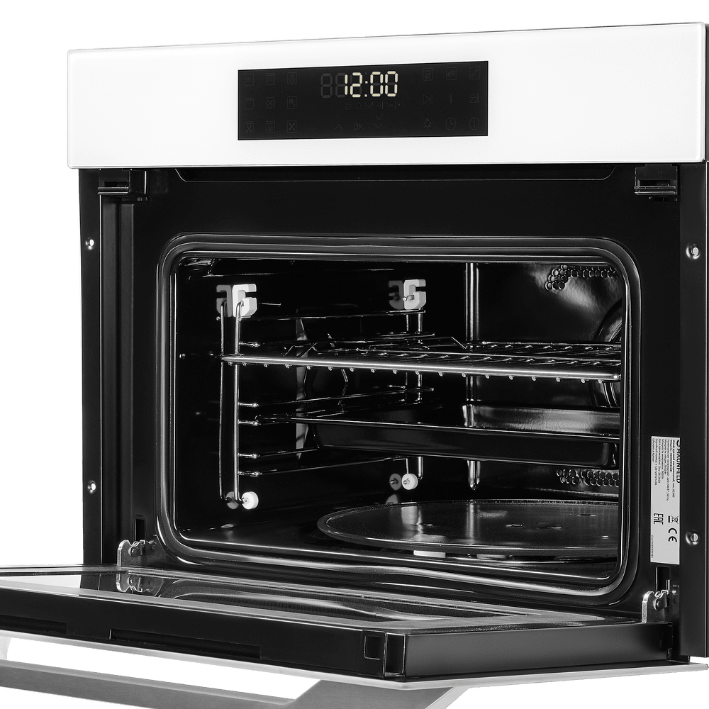 Особенности дизайна и внешней панели управления — также важный пункт при выборе духовки на кухню. В данной модели нужно обратить внимание на цвет — белый, охлаждение двери, чтобы поверхность и мебель вокруг не нагревались.