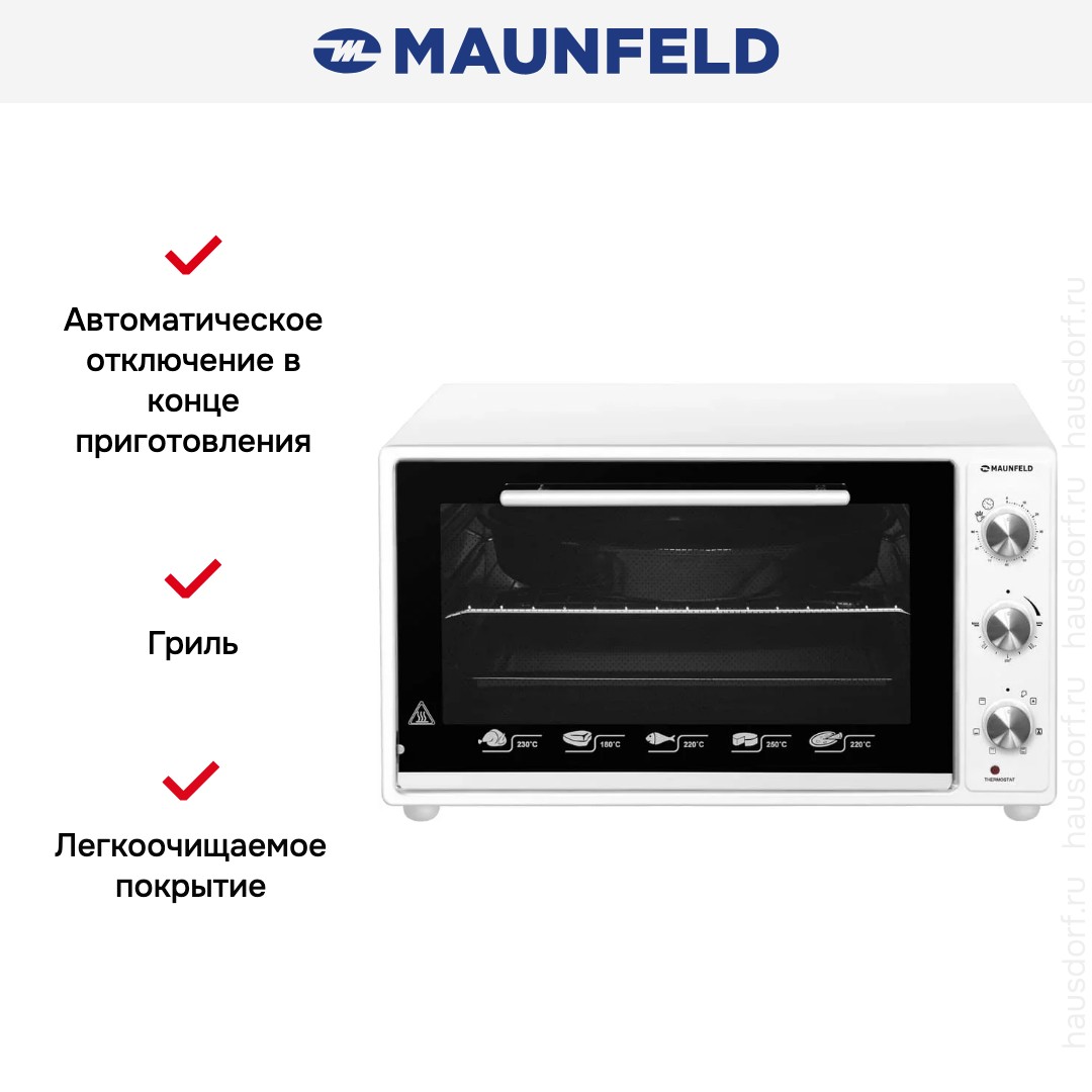 Количество режимов работы в духовом шкафу Маунфилд: 7. В число доступных программ входят: классический нагрев, верхний нагрев, нижний нагрев, конвекция, гриль для создания хрустящей корочки, и другие. Тип гриля в этой модели — электрический.