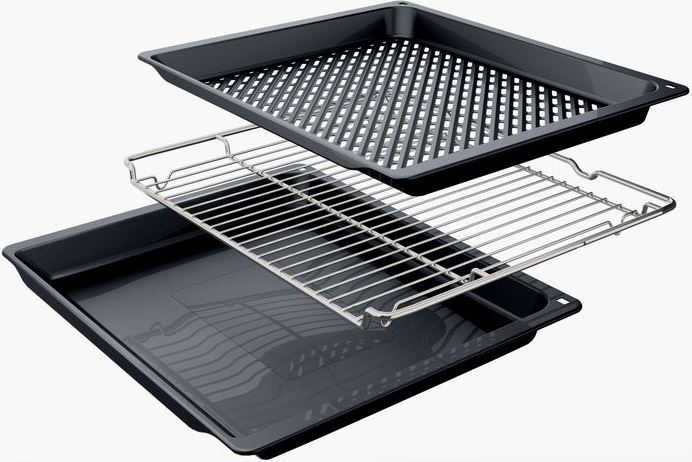 В стандартную комплектацию любого духового шкафа входят один или два противня — эмалированных или с антипригарным покрытием — и решетка. Единственный противень, как правило, имеет низкие бортики и предназначается для приготовления выпечки. Если духовка комплектуется двумя противнями, то второй отличается более высокими бортиками — его можно использовать для запекания мяса, птицы, овощных блюд. На решетке в духовке, не оснащенной грилем, обычно устанавливаются формы для запекания — стальные, керамические или стеклянные. В духовках премиум-класса количество противней может быть увеличено: к стандартному комплекту добавляются противни с перфорацией для мяса, специальные поддоны для сбора выделившегося сока.