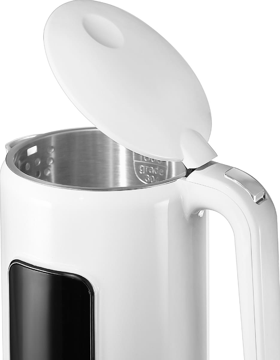 Колба изготовлена из высококачественной нержавеющей стали, устойчивой к коррозии, царапинам и перепадам температур. Корпус сочетает прочный пластик и металлические элементы, обеспечивая лёгкость, термоизоляцию и надёжность. Белоснежное исполнение придаёт прибору лаконичный и свежий вид, гармонично дополняя как минималистичные, так и классические интерьеры кухни.