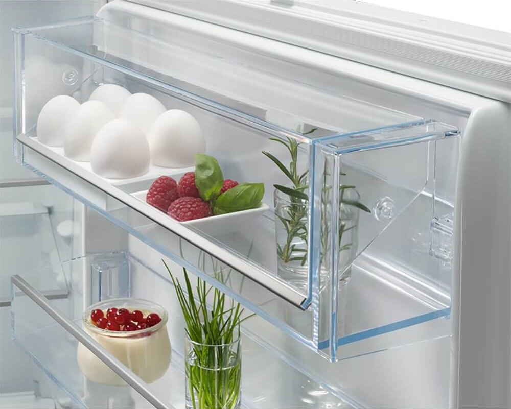 Ящики для продуктов изготавливаются либо целиком из прозрачного пластика, либо часто имеют переднюю прозрачную панель, которая обеспечивает лучший обзор. Полки в большинстве холодильников могут перемещаться по высоте, устанавливаются на специальных направляющих и без труда снимаются для очистки.