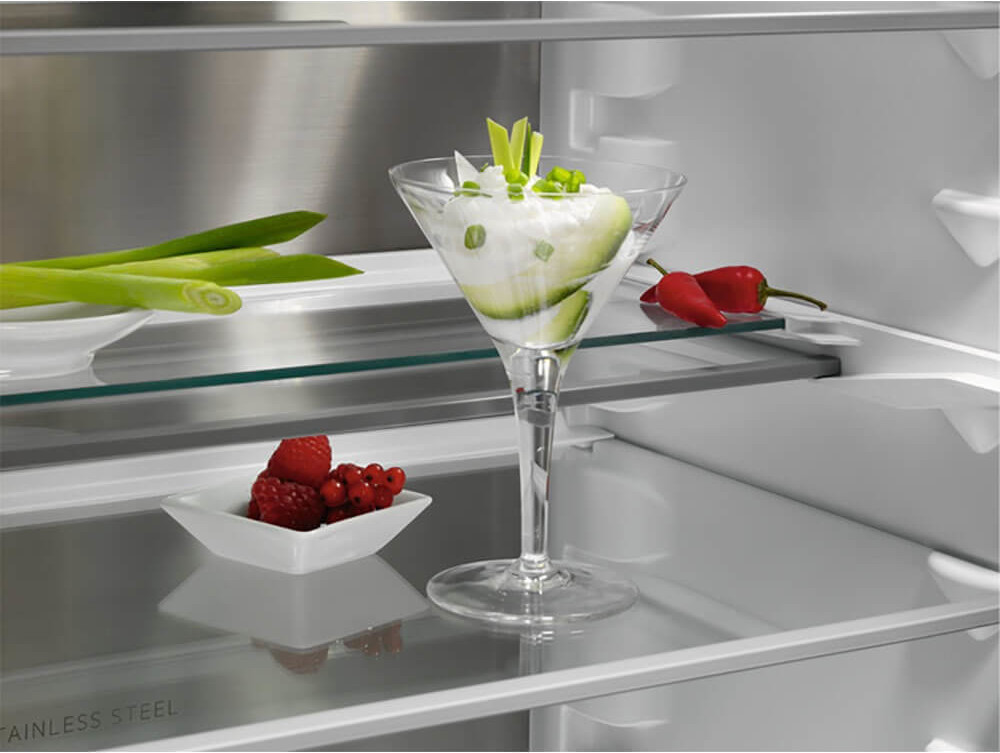 Регулируемые полки в холодильнике позволяют эффективно организовать хранение продуктов и облегчают их поиск в камере. Как правило, полки в холодильной камере изготавливаются из закаленного стекла, способного выдерживать большие нагрузки. Стекло является наиболее безопасным, прочным, нейтральным материалом, благодаря его прозрачности на полках можно легко отыскать любые продукты, а специальный бортик предохраняет устройство от протекания.