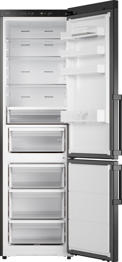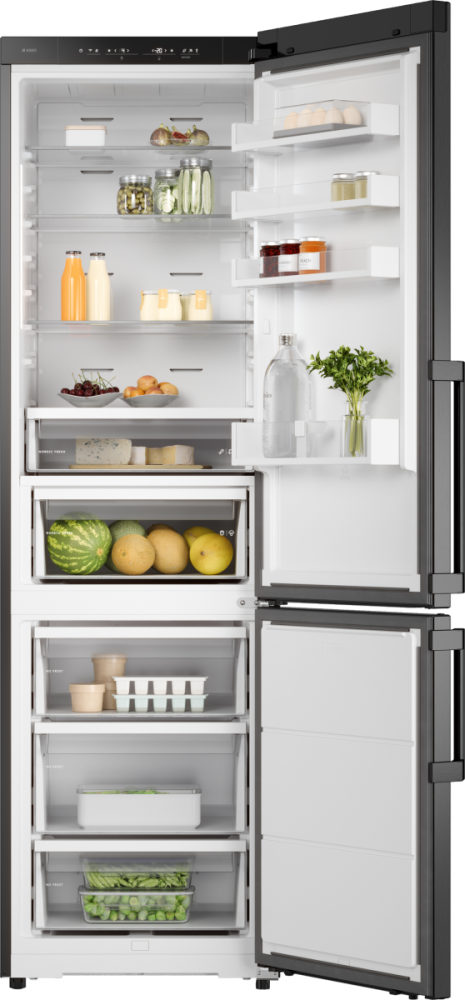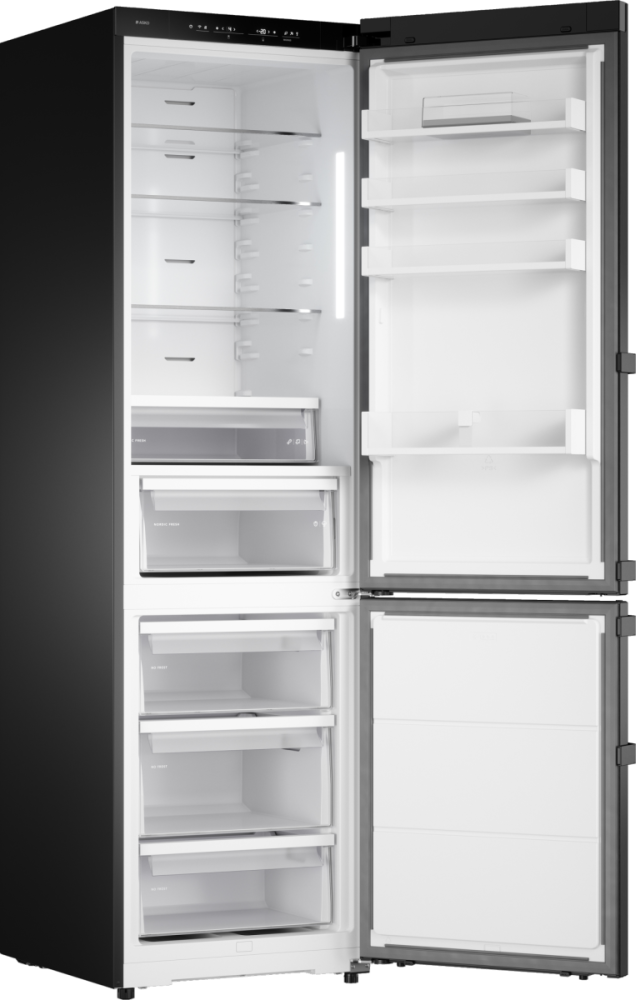 Холодильник ASKO RFC226RNB B1 — стильное и продуманное устройство серии Series 2 в цвете черная сталь, созданное для тех, кто ценит утонченность и функциональность в одном корпусе. Отдельностоящий прибор высотой 203 см, шириной 59 см и глубиной 65 см (габариты 203×59×65 см, упаковка 210×66×79 см) сочетает в себе холодильную и морозильную секции: 2 камеры с расположением низкотемпературного отсека снизу обеспечивают общую вместимость 442 л и полезный объем 388 л, при этом холодильный отсек имеет общий объем 295 л (полезный 267 л), а морозильный — 147 л (полезный 121 л). Внутренняя организация продумана до мелочей: в холодильной части три прочные стеклянные полки, четыре полки в дверце, лоток для яиц и зона свежести Nordic Fresh с двумя контейнерами для длительного хранения продуктов; морозилка оснащена тремя выдвижными ящиками, лотком для льда и функциями суперзамораживания и No Frost, что исключает образование инея и снижает необходимость ручной разморозки. Управление реализовано электронно при помощи сенсорных кнопок и LED-дисплея, предусмотрено регулирование температуры, индикация открытой двери звуковая, а при повышении внутренней температуры срабатывает световой и звуковой сигнал; также доступно приложение ConnectLife для дистанционного контроля и дополнительные режимы — Шаббат, Вечеринка и Режим очистки, плюс адаптивный температурный контроль и контроль уровня влажности для оптимального микроклимата. Технические характеристики отвечают современным требованиям: инверторный компрессор на одном блоке с экологичным хладагентом R600A гарантирует тихую работу на уровне 34 дБ, энергоэффективность класса A++ при годовом расходе 197 кВт·ч и возможность автономного сохранения холода до 13 часов; производительность замораживания достигает 13 кг/сутки. Дополнительные удобства включают возможность перевешивания дверей (упор справа по умолчанию), регулируемые ножки, ручку с гравировкой бренда и комплектную полку для бутылок на телескопических направляющих для легкого доступа. Внешний минималистичный дизайн в сочетании с антибактериальным покрытием внутри обеспечивает не только презентабельный вид, но и гигиеничность хранения, а циркуляционная система охлаждения равномерно распределяет холод по трём температурным зонам, улучшая сохранность еды и напитков; длина шнура 3 м, напряжение питания 220-240 В и частота 50-60 Гц делают установку гибкой в домашних условиях. Этот аппарат — продуманное решение для большой семьи или тех, кто любит запасаться продуктами заранее: вместительность, интеллектуальные режимы и надежные технические решения гарантируют комфорт в эксплуатации и долгий срок службы.