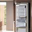Встраиваемые холодильники монтируются в нишу или колонну. Передняя их часть закрывается декоративным мебельным фасадом и снаружи не отличается от дверцы обычного кухонного шкафа, так что их не нужно подбирать под интерьер помещения. Объем этих холодильников, как правило, несколько меньше, чем у отдельностоящих, так как при встраивании необходимо оставлять свободное пространство для вентиляции. Они отличаются меньшим уровнем шума, а также лучше держат холод и отличаются большей экономичностью из-за дополнительного слоя изоляции. Ассортимент этих холодильников не так велик, как у отдельно стоящих, установка более трудоемкая, а стоимость обычно несколько выше.