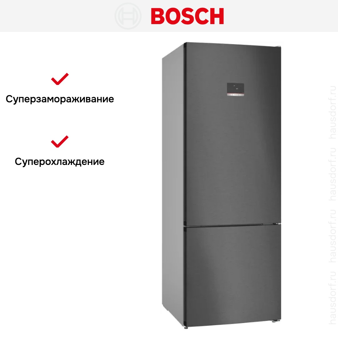 Холодильник Bosch KGN56CX30U — стильный двухкамерный агрегат в цвете черная сталь, созданный для тех, кто ценит порядок и продуманный интерьер. Холодильная камера предложит 400 литров полезного объема и четыре стеклянные полки, три из которых регулируются по высоте, что упрощает размещение контейнеров разного объема. Морозильный отсек, расположенный снизу, имеет 105 литров полезного объема и оснащен двумя вместительными ящиками, что удобно для сортировки продуктов. Встроенные вертикальные ручки создают цельный силуэт фасада и облегчают открытие дверей. Вес 90,7 кг и прочная конструкция делают прибор устойчивым и долговечным.