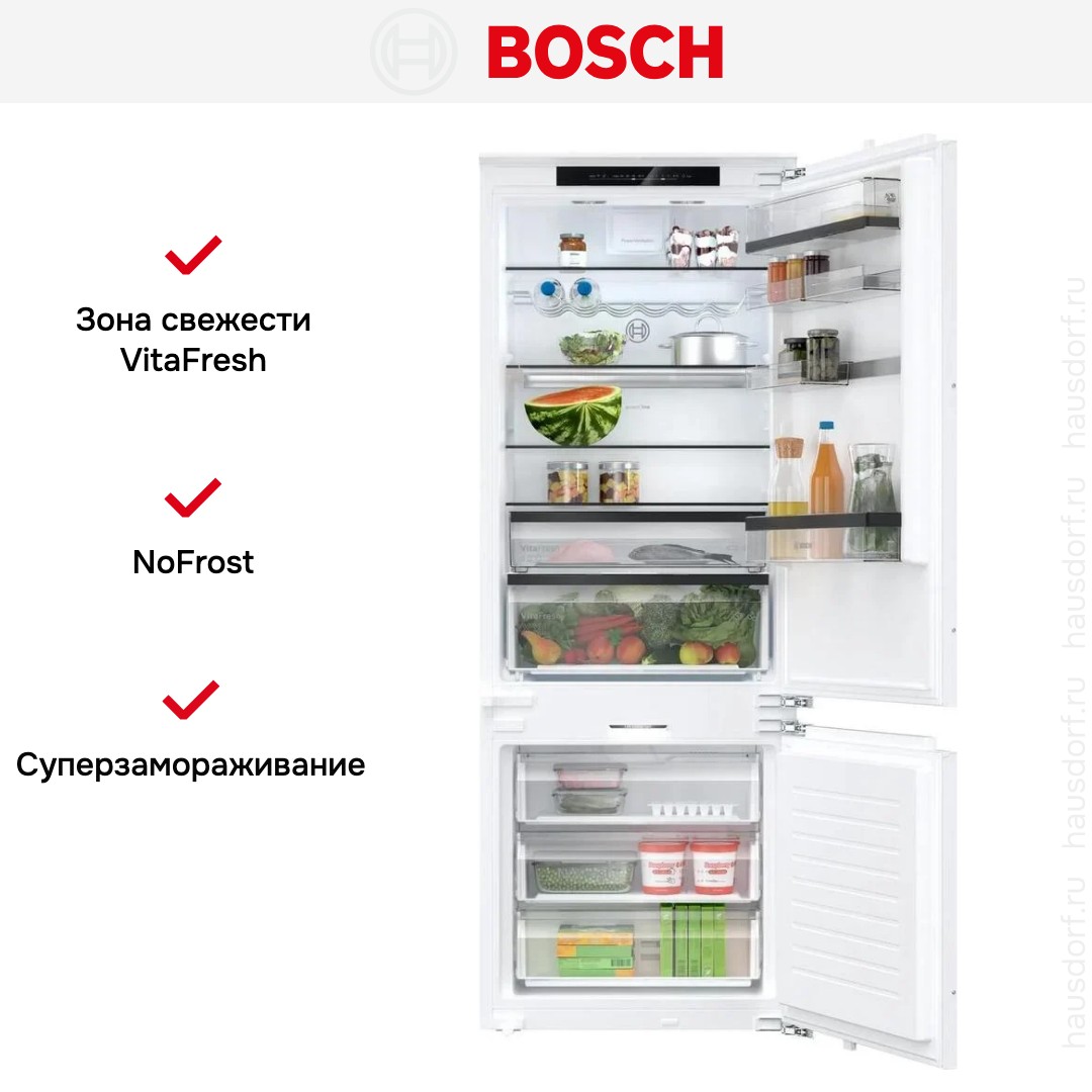 Зона свежести VitaFresh в холодильниках Bosch служит для увеличения срока хранения продуктов — от овощей и фруктов до свежего мяса и рыбы — без их заморозки. В ней поддерживается оптимальная температура около 0°C, а влажность в разных отделениях может регулироваться в зависимости от типа продуктов.