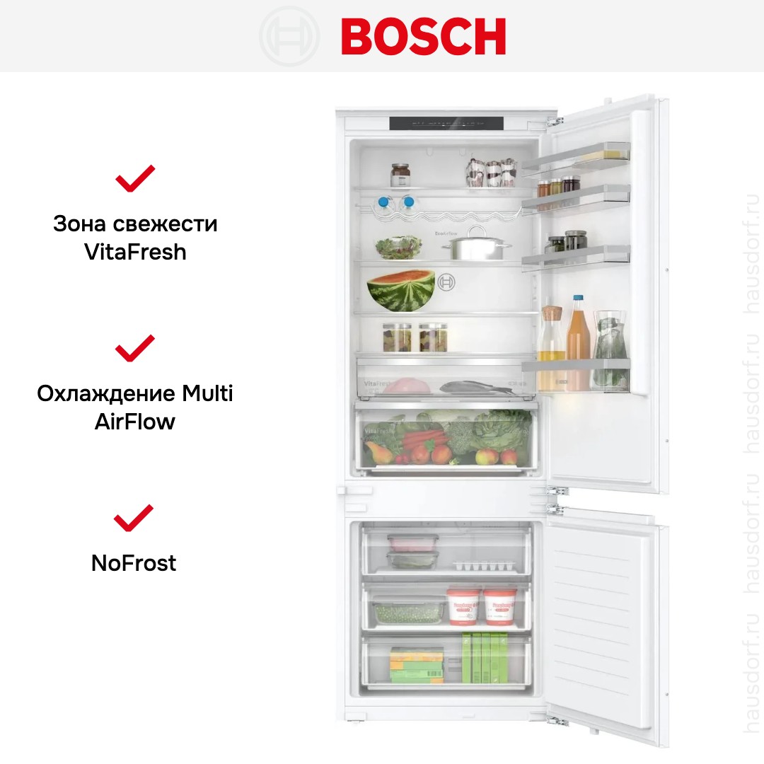 Охлаждение Multi AirFlow в холодильниках Bosch — многопоточная система, которая с помощью вентилятора распределяет холодный воздух по всему пространству холодильной камеры. Воздушные потоки достигают самых труднодоступных уголков, так что температура и влажность во всей камере выравнивается.