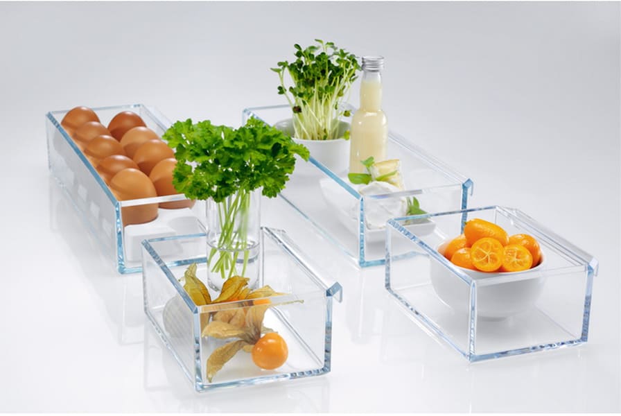 Ящики для продуктов изготавливаются либо целиком из прозрачного пластика, либо часто имеют переднюю прозрачную панель, которая обеспечивает лучший обзор. Полки в большинстве холодильников могут перемещаться по высоте, устанавливаются на специальных направляющих и без труда снимаются для очистки.