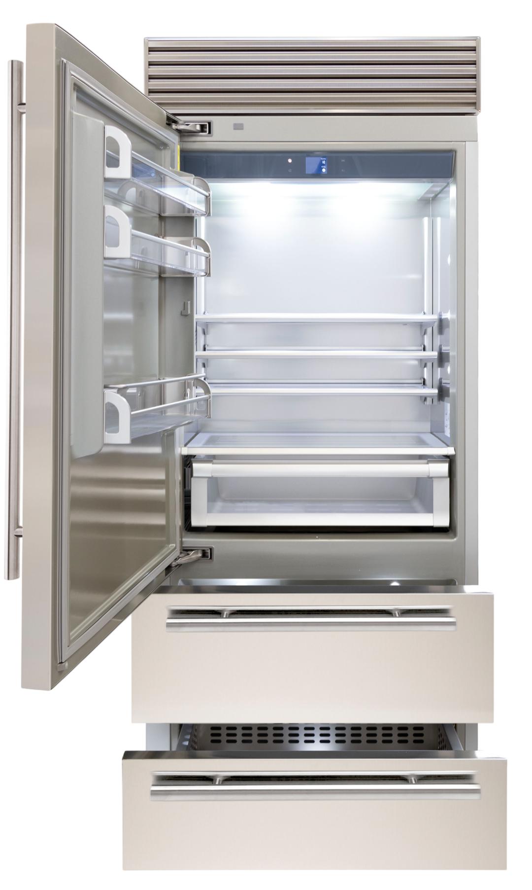 Трехкамерные модели выпускаются в нескольких вариантах. В некоторых случаях в качестве третьей камеры поступает так называемая зона свежести — отделение, где поддерживается температура около 0 градусов. В другом варианте подобные модели имеют морозильную камеру, состоящую из двух выдвижных ящиков.