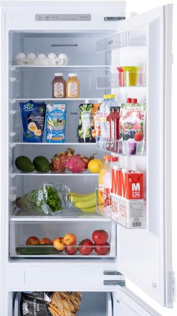 Встраиваемые холодильники монтируются в нишу или колонну. Передняя их часть закрывается декоративным мебельным фасадом и снаружи не отличается от дверцы обычного кухонного шкафа, так что их не нужно подбирать под интерьер помещения. Объем этих холодильников, как правило, несколько меньше, чем у отдельностоящих, так как при встраивании необходимо оставлять свободное пространство для вентиляции. Они отличаются меньшим уровнем шума, а также лучше держат холод и отличаются большей экономичностью из-за дополнительного слоя изоляции. Ассортимент этих холодильников не так велик, как у отдельно стоящих, установка более трудоемкая, а стоимость обычно несколько выше.