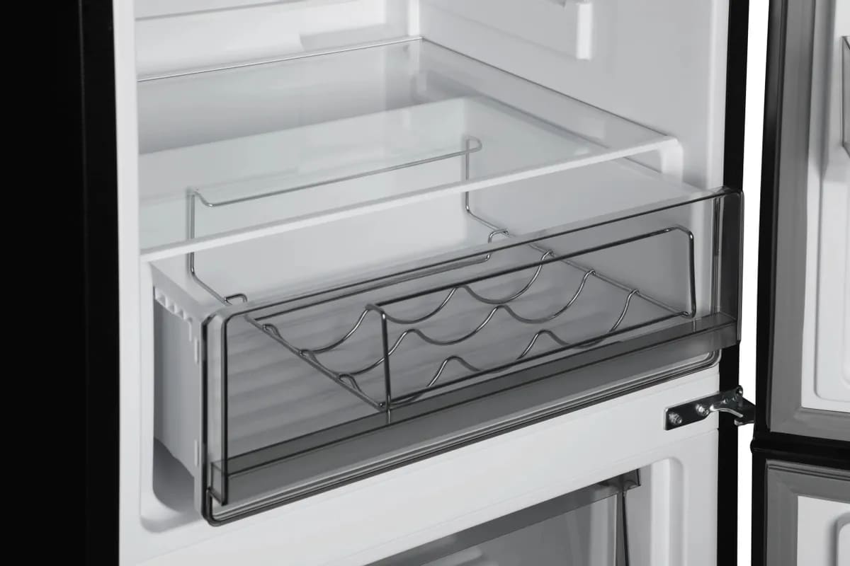 Для стеклянных бутылок, особенно винных и содержащих другие алкогольные напитки, предусматривается размещение на подвесной решетчатой металлической полке. Бутылки на ней располагаются в горизонтальном положении — это оптимальный способ хранения вин. Съемная металлическая полка легко моется под краном.