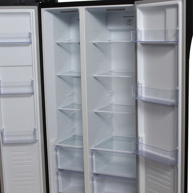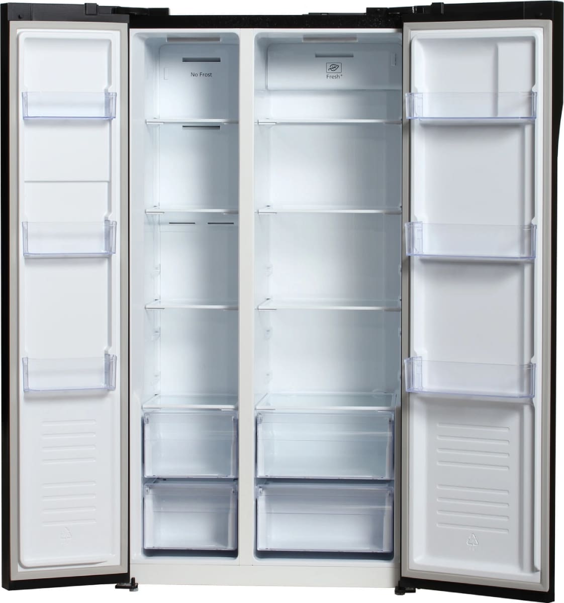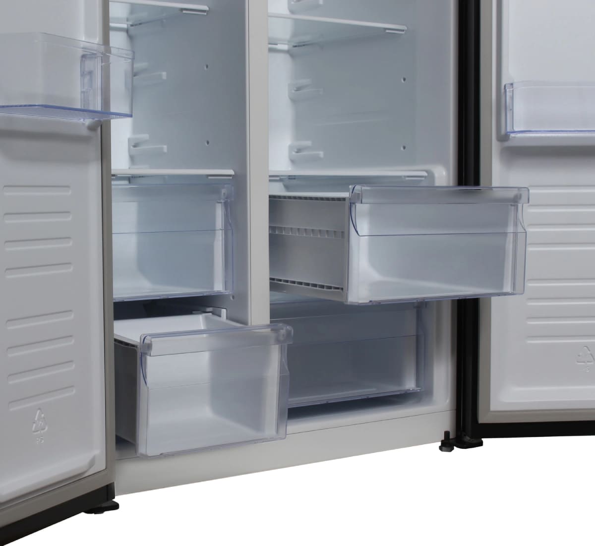 Данная модель — отдельностоящая, поэтому нужно тщательно подобрать место для ее размещения. Холодильник Side-by-Side с необычным расположением камер — сбоку друг от друга — позволяет увеличить объем продуктов для хранения. Такой вариант подходит обладателям просторной кухни, большим семьям, людям, которые запасают продукты и готовят впрок. Количество камер: 2.