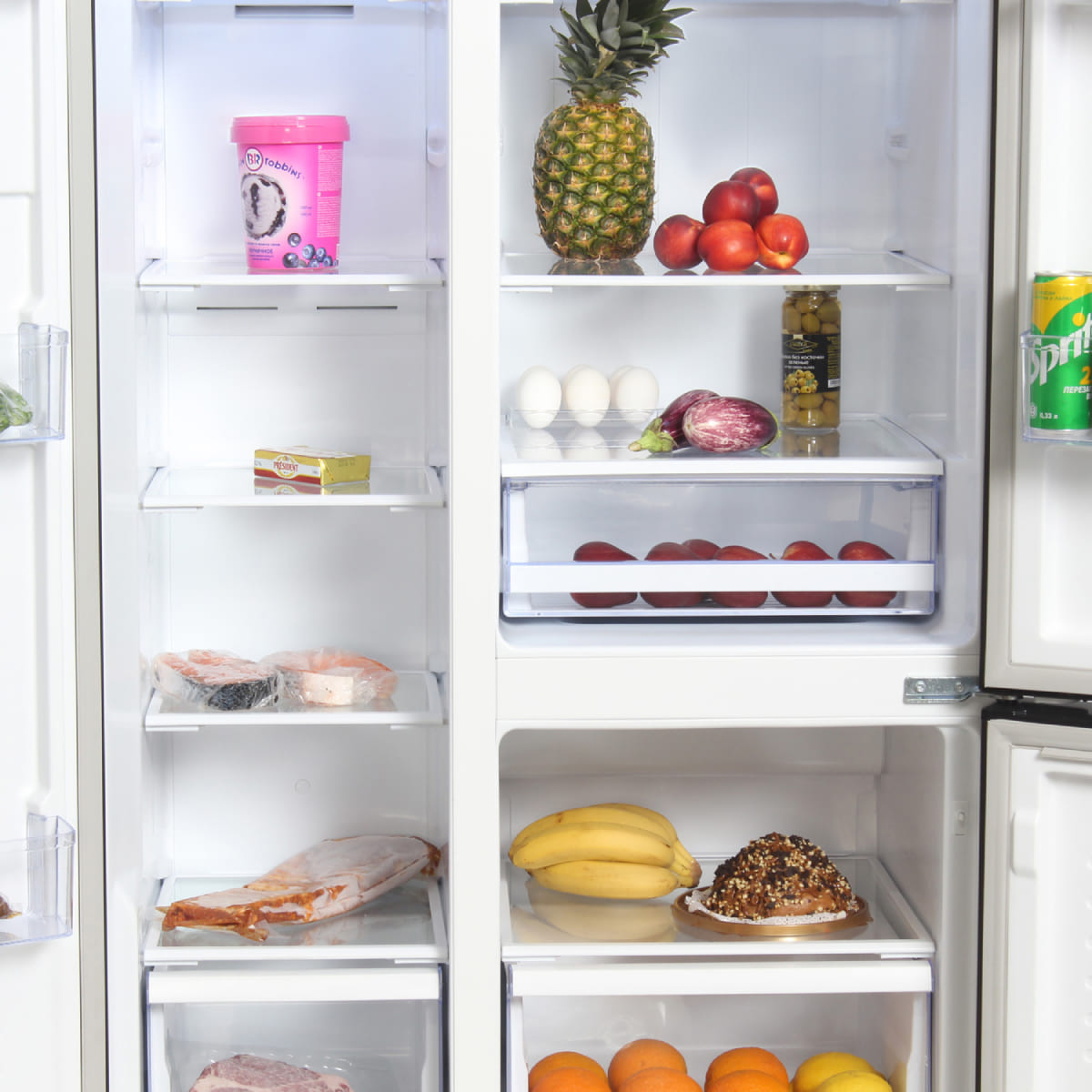 Внутреннее наполнение холодильной и морозильной камер включает многочисленные и разнообразные полки, ящики, контейнеры. Все они используются для более удобного и рационального размещения продуктов, которое обеспечивает хороший обзор содержимого холодильника и быстрый поиск.