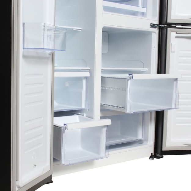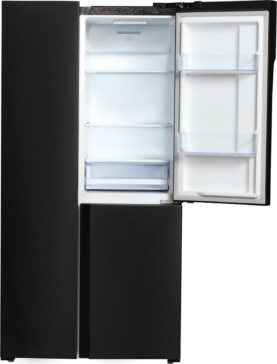 Данная модель — отдельностоящая, поэтому нужно тщательно подобрать место для ее размещения. Холодильник Side-by-Side с необычным расположением камер — сбоку друг от друга — позволяет увеличить объем продуктов для хранения. Такой вариант подходит обладателям просторной кухни, большим семьям, людям, которые запасают продукты и готовят впрок. Количество камер: 3.