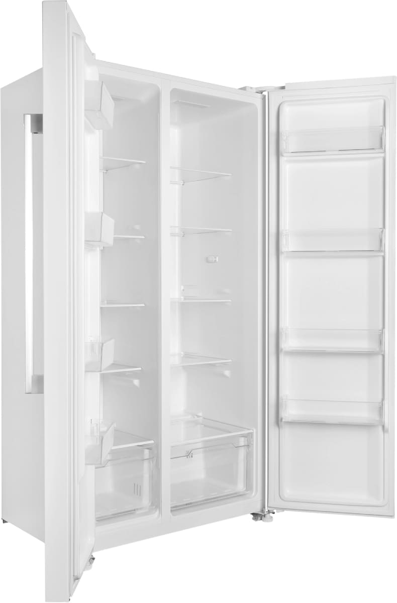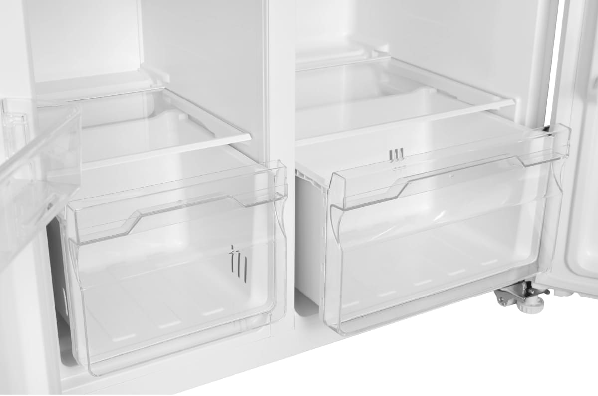 Данная модель — отдельностоящая, поэтому нужно тщательно подобрать место для ее размещения. Холодильник Side-by-Side с необычным расположением камер — сбоку друг от друга — позволяет увеличить объем продуктов для хранения. Такой вариант подходит обладателям просторной кухни, большим семьям, людям, которые запасают продукты и готовят впрок. Количество камер: 2.