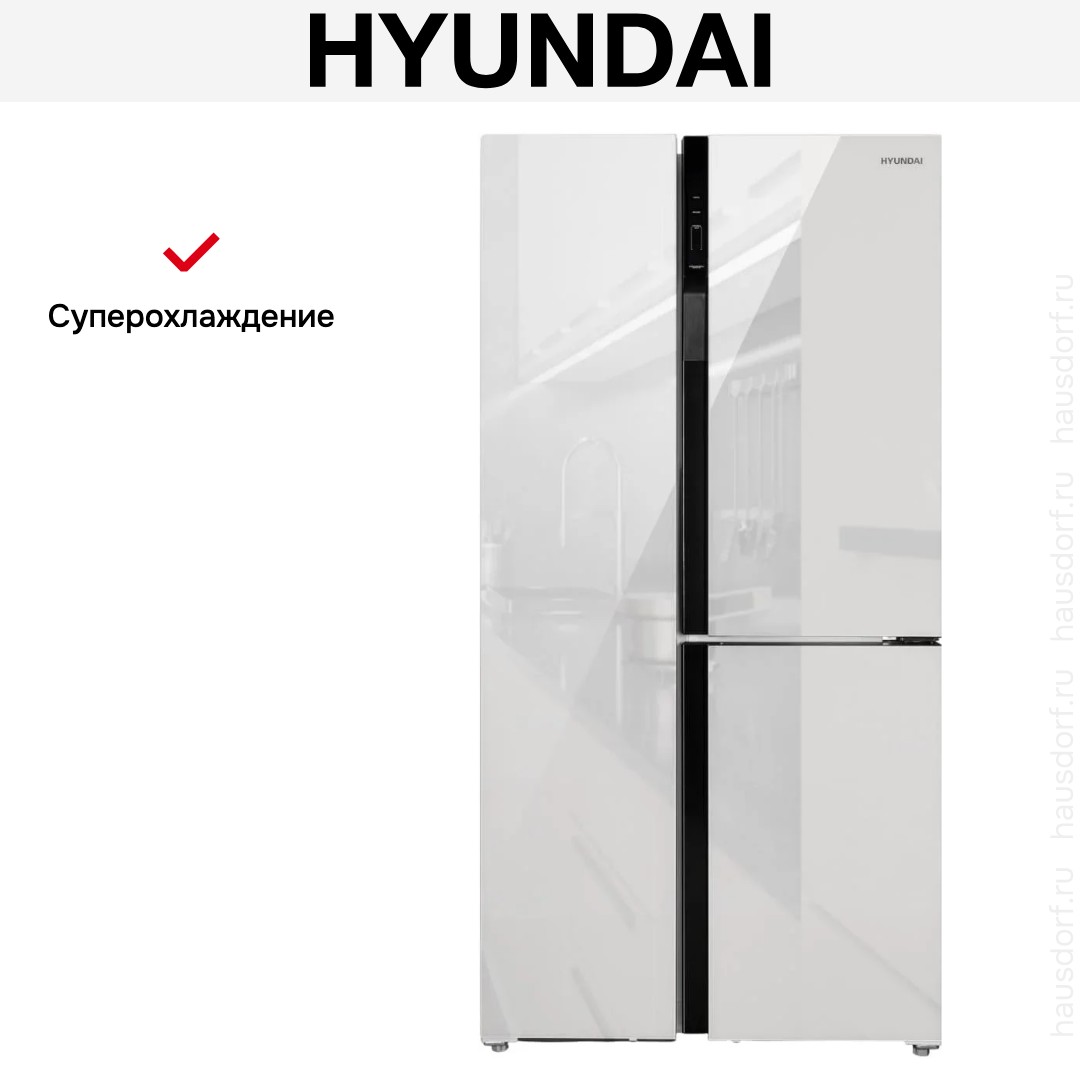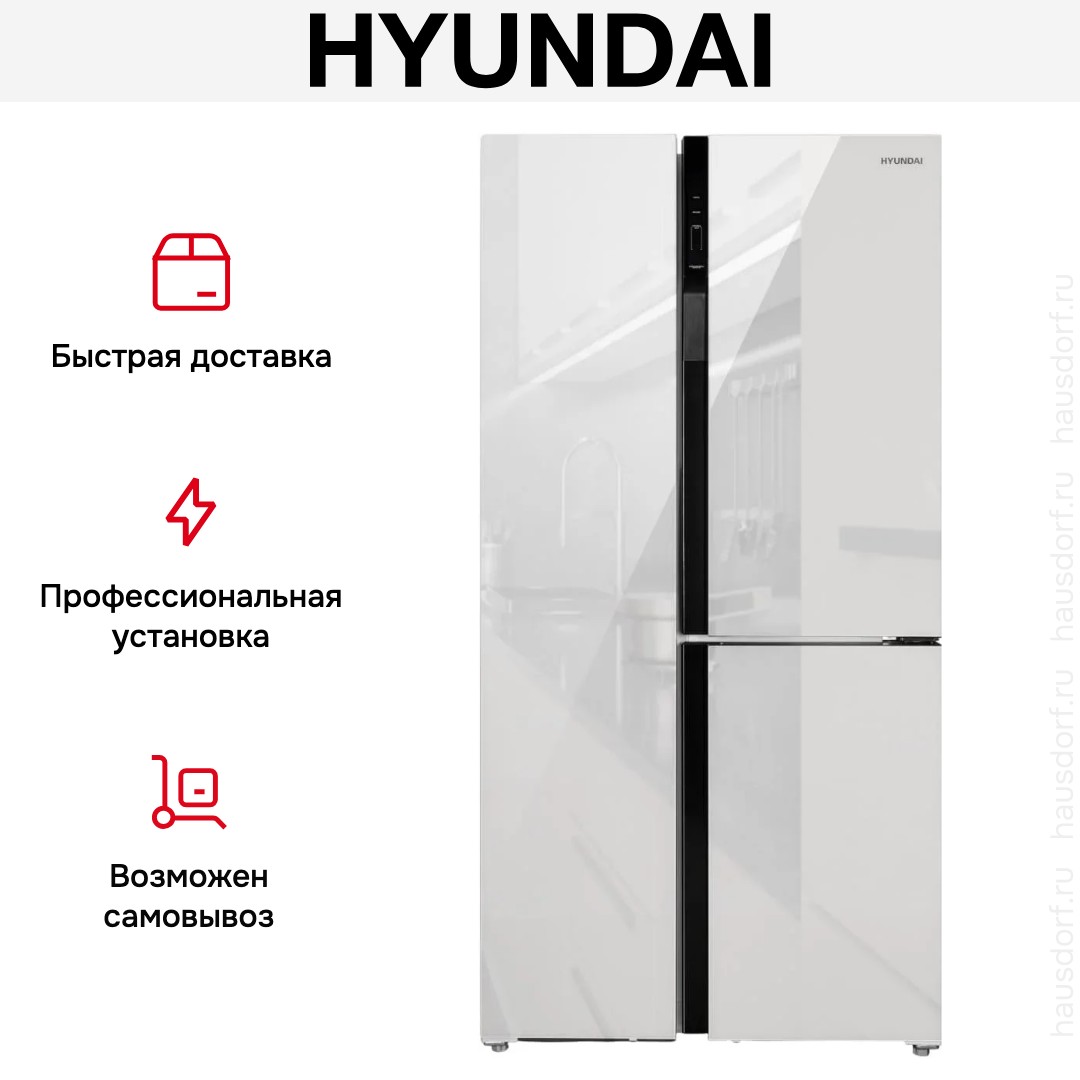 Холодильник Hyundai CS6073FV — современный отдельно стоящий прибор конструкции Side-by-Side. Его дизайн с белым стеклянным фронтом и встроенными вертикальными ручками превращает хранение продуктов в удобный и эстетичный процесс. Высота 183 см, ширина 91,1 см и глубина 72,6 см делают агрегат заметным, но при этом гармоничным элементом кухни. Три двери позволяют организовать доступ к разным зонам без лишних движений.